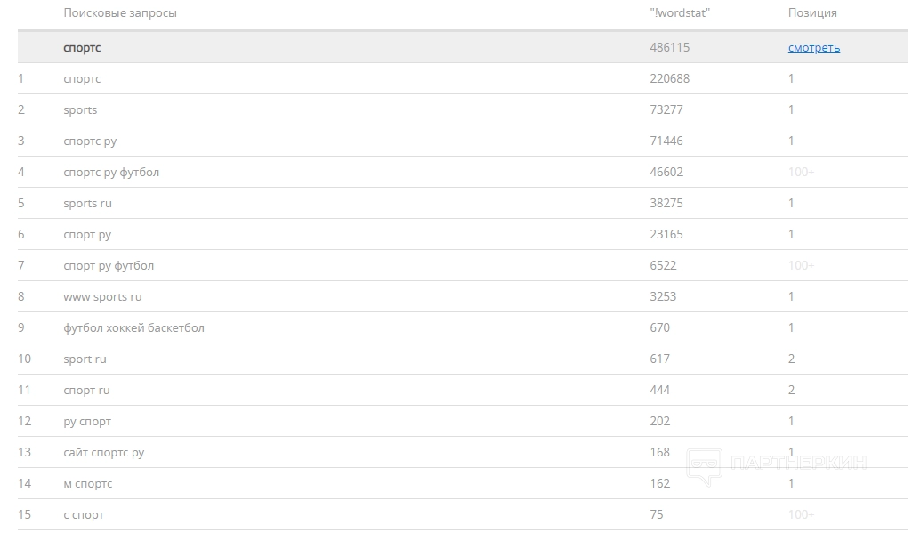 Подбор запросов по URL. Сервис подбирает поисковые запросы. Как это выглядит для сайта sports.ru: