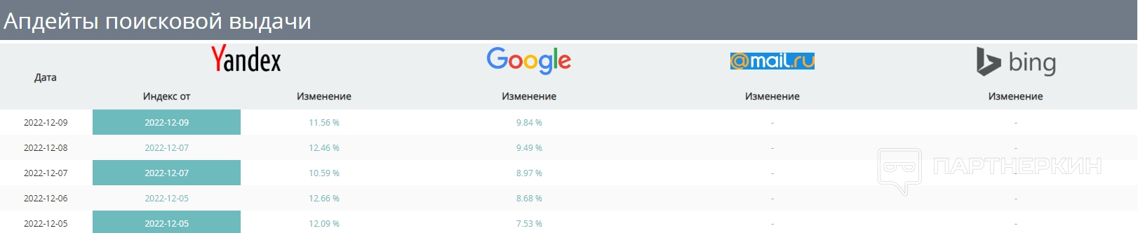 Апдейты . Инструмент показывает график точных апдейтов выдачи поисковых систем «Яндекс», Google, Mail и Bing. Опция пригодится SEO-оптимизаторам, которые отслеживают изменения позиций в результатах выдачи.