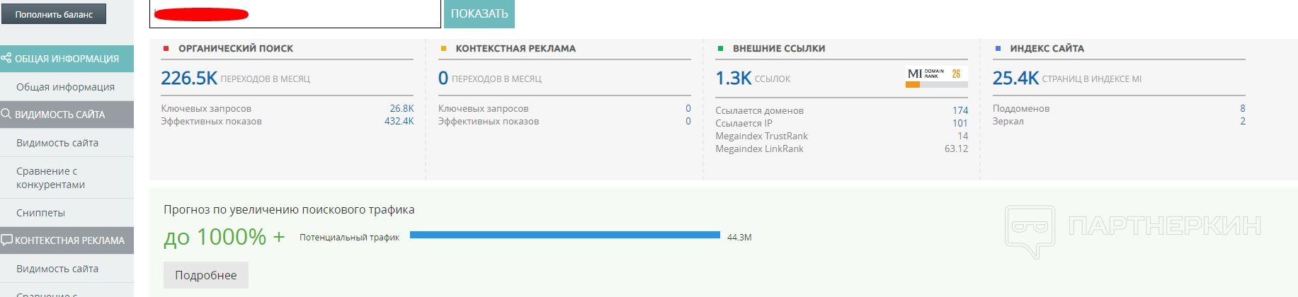 Здесь отображается информация по следующим показателям: органический поиск, контекстная реклама, внешние ссылки, индекс сайта. Ниже представлена статистика по видимости ресурса: