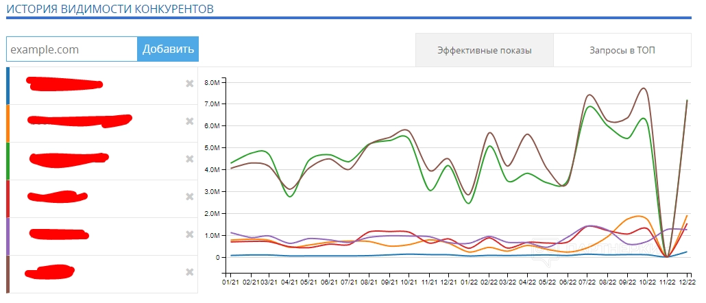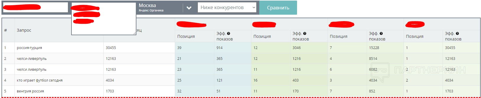 В фильтре нужно указать собственный ресурс и добавить три сайта конкурентов, чтобы провести сравнение по позиции ресурса в поисковиках и посмотреть статистику эффективности показов. Полученные данные можно экспортировать в текстовом формате CSV.