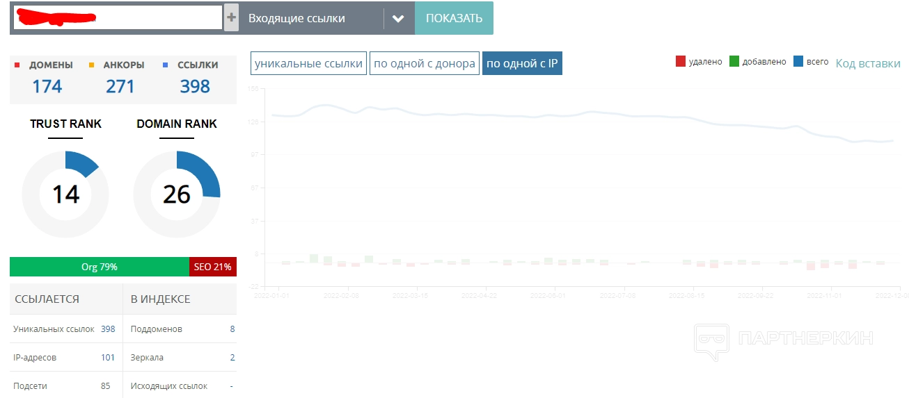 - количество ссылающихся IP-адресов на страницу из выдачи / весь сайт;