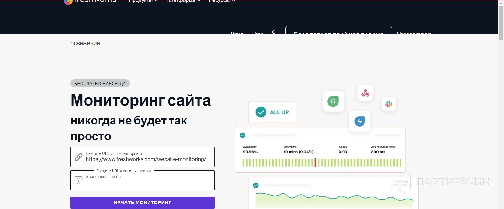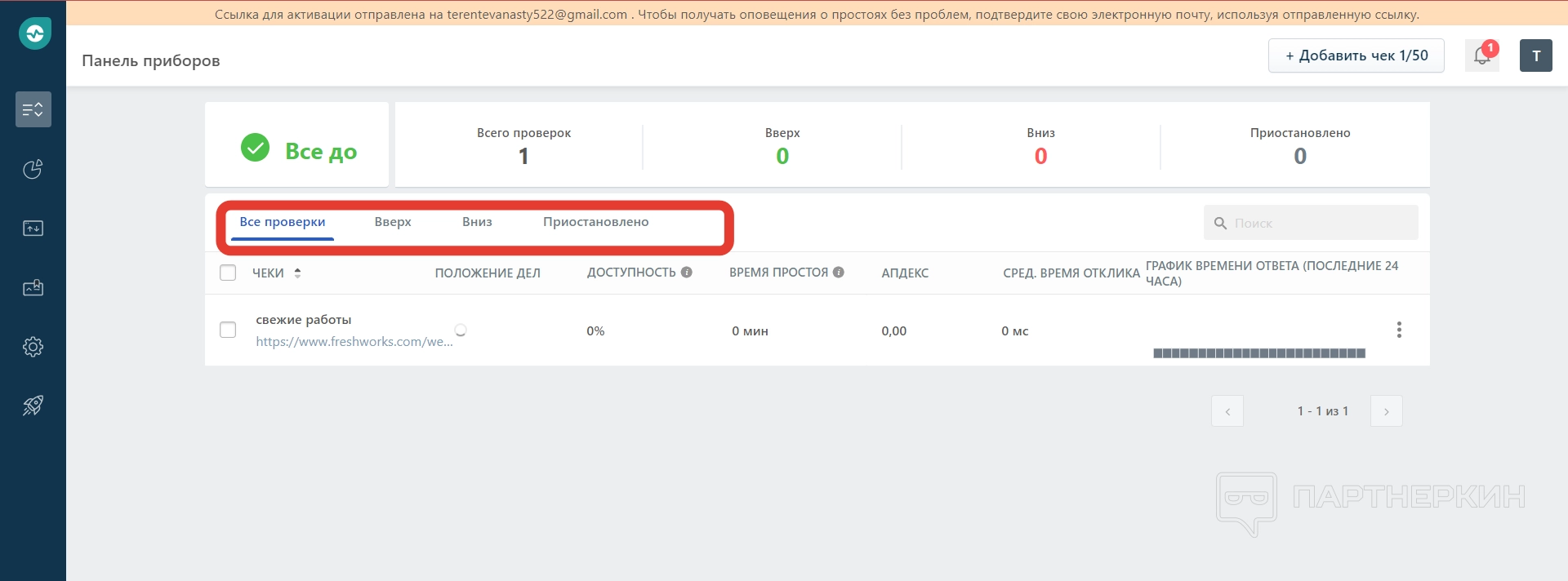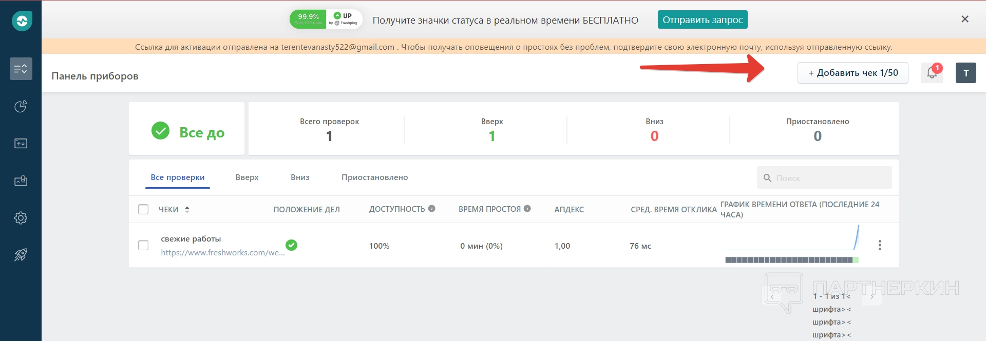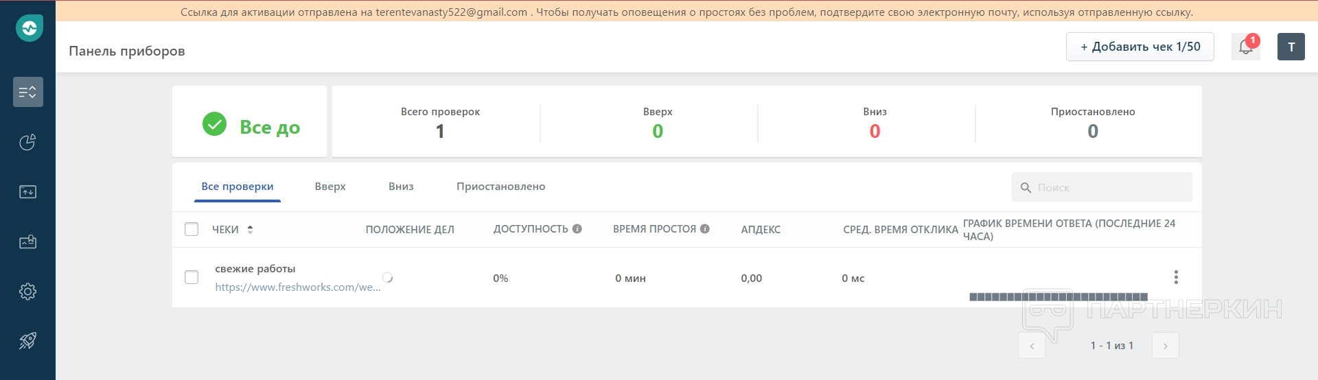 Сразу после этого происходит автоматическая регистрация, и проверка стартует. Показываться данные будут в небольшой табличке — там отображаются сам урл, положение дел, доступность, время простоя, среднее время отклика, график времени ответа.