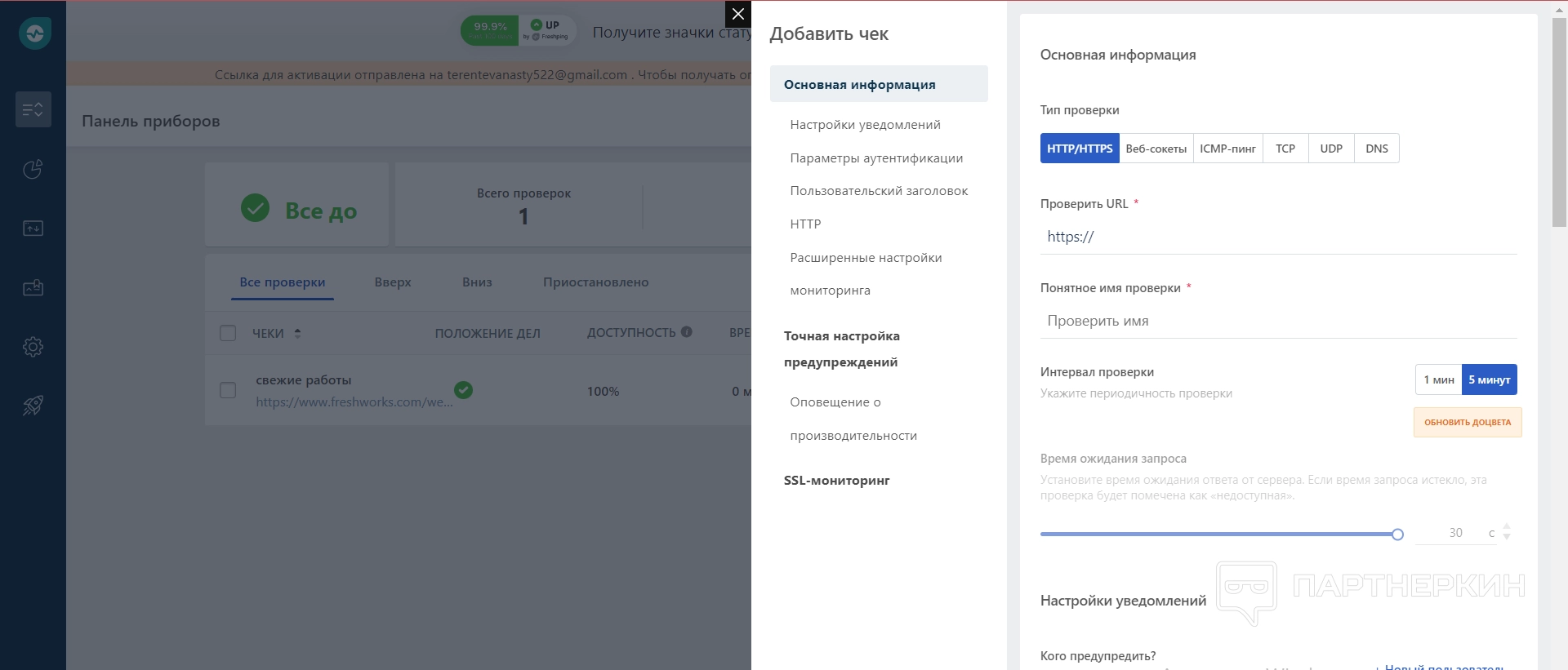 Там уже придется вводить более подробные данные по необходимости — тип проверки, урл, название проверки, интервалы, время ожидания, уведомления о результатах и прочее.