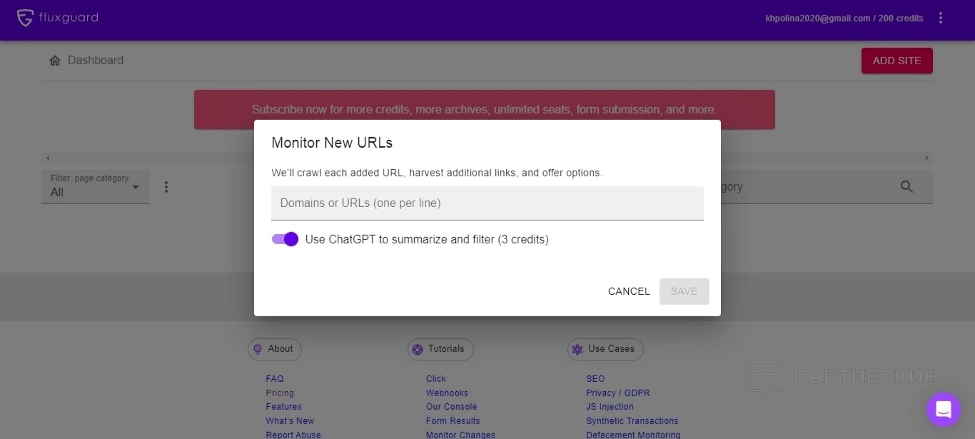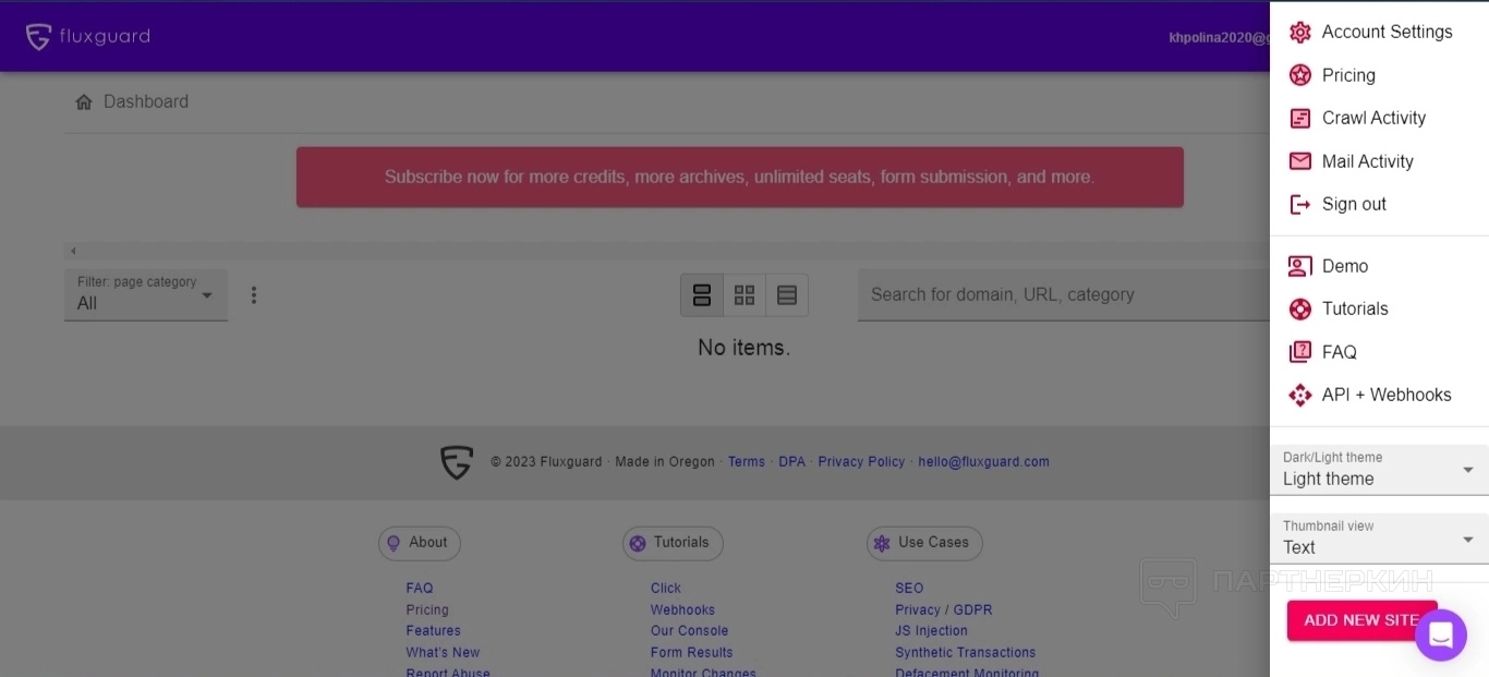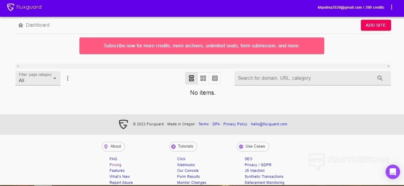 Регистрация пройдена успешно и пользователь попадает в свой профиль. На главной странице в дальнейшем будут отображаться все веб-ресурсы, на которые запущен мониторинг. При регистрации и использовании демо-версии, каждому пользователю бесплатно выдается 200 кредитов на запуск проверок.