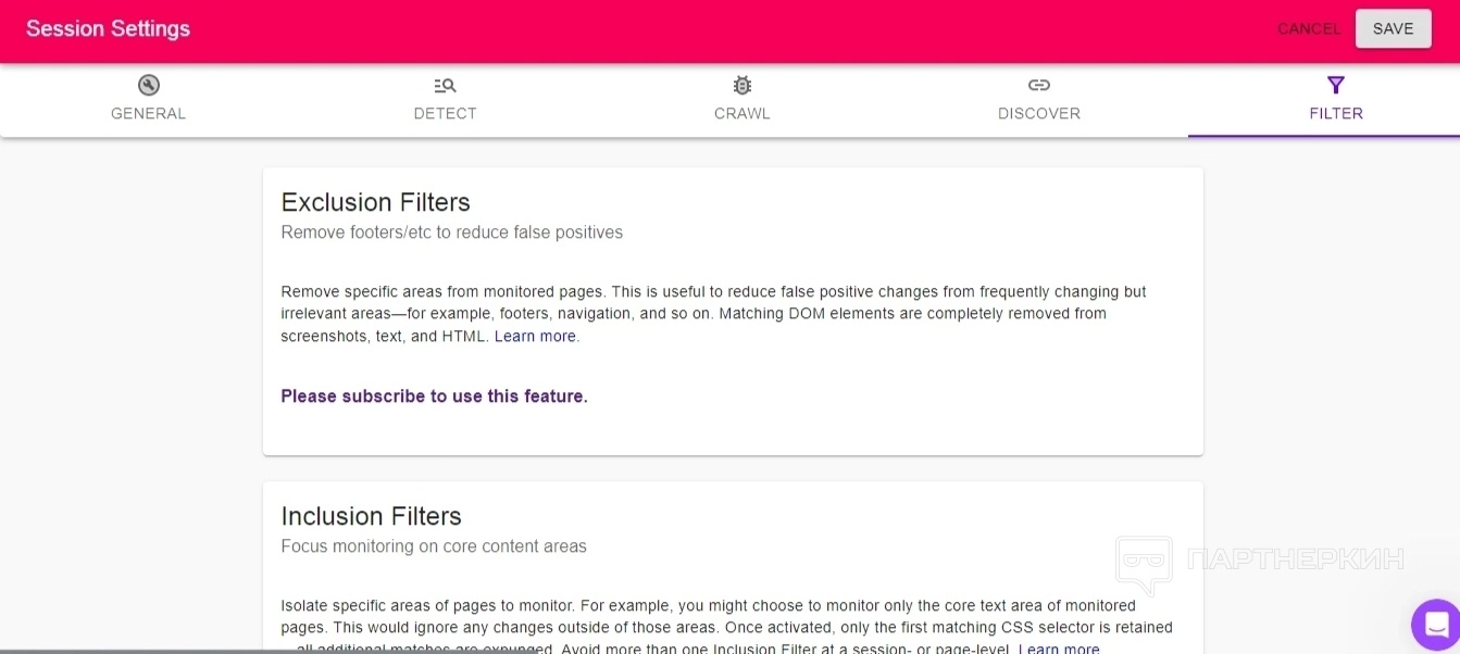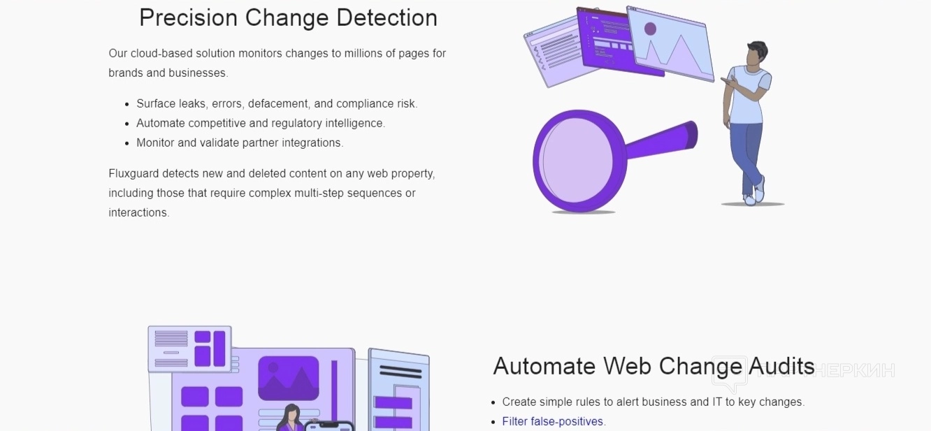 - отслеживание не только поверхностных изменений или ошибок, но еще и интеграции партнеров, новый и удаленный контент, изменения текста, HTML-изменения, cookie и многое другое;