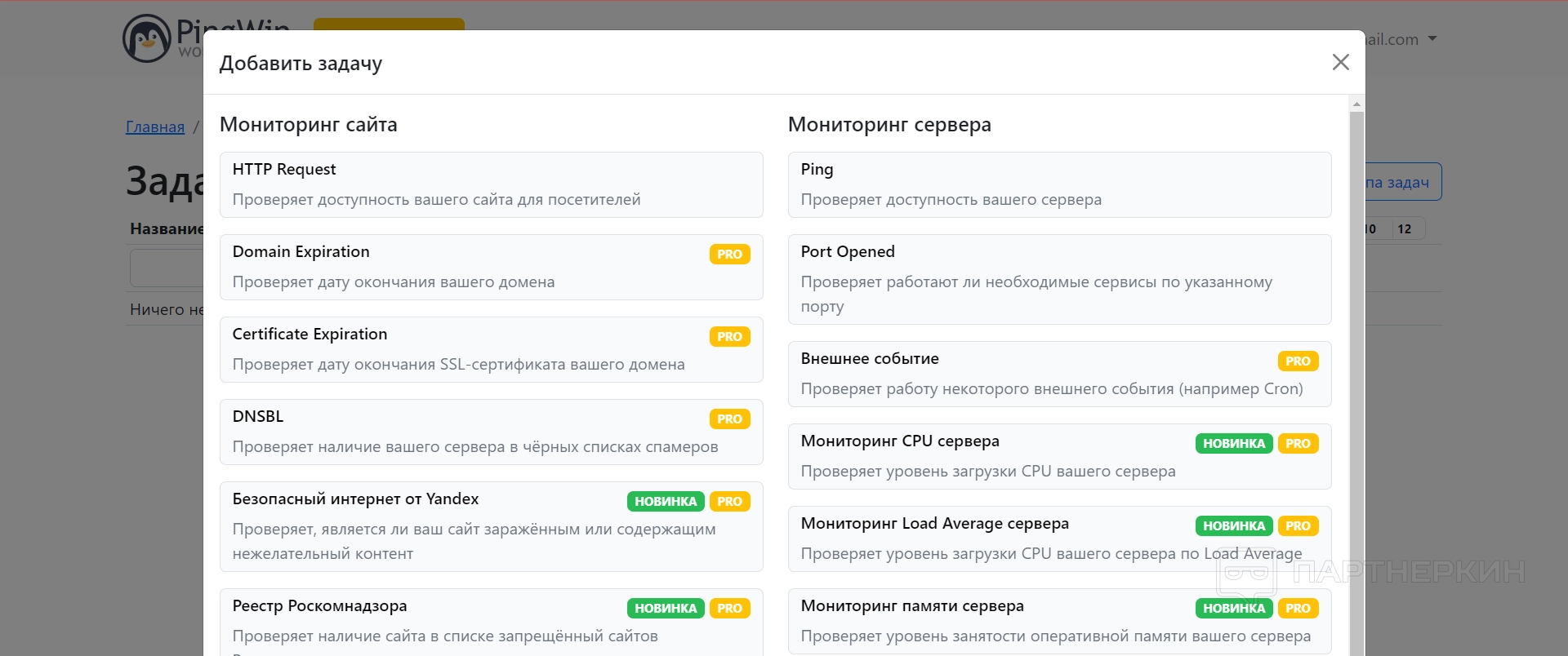 При добавлении новой задачи нужно сначала выбрать, какой тип мониторинга нужен — сервис позволяет мониторить не только сайты, но и сервера. Поэтому выбирать нужно ту задачу, которая соответствует типу мониторинга.