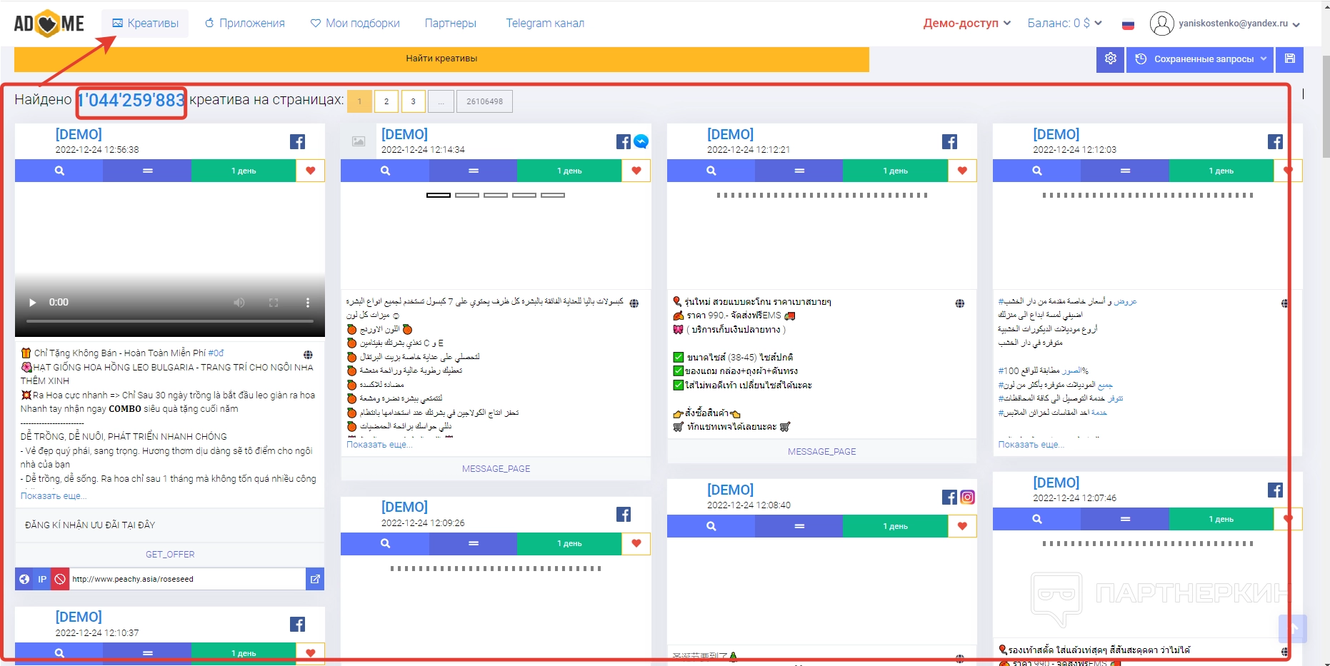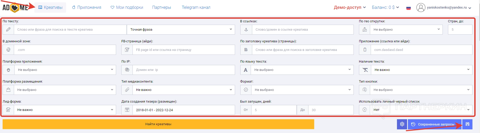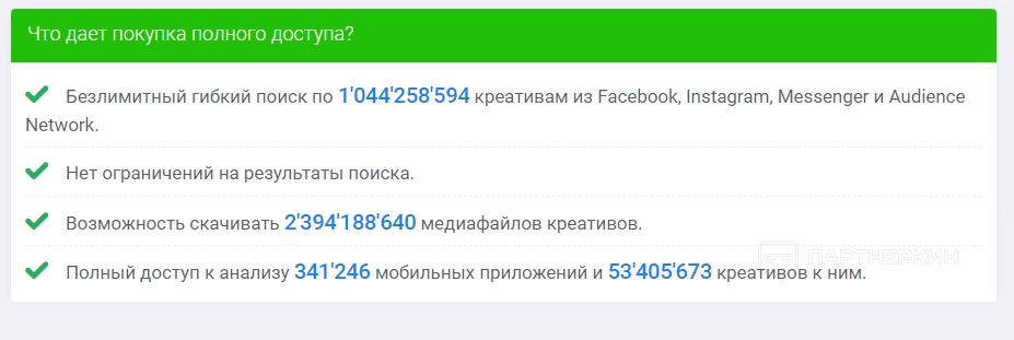 Обращаем внимание, что личный кабинет работает в демо-режиме. Это означает, что функционал ограничен, поэтому не все инструменты будут доступны для изучения. Во-первых, накладываются ограничения на количество запросов к поиску и число результатов по запросам. Во-вторых, пользователь в бесплатном режиме не сможет скачивать креативы. Чтобы открыть весь функционал, нужно выбрать и оплатить один из тарифов. Об этом чуть ниже.