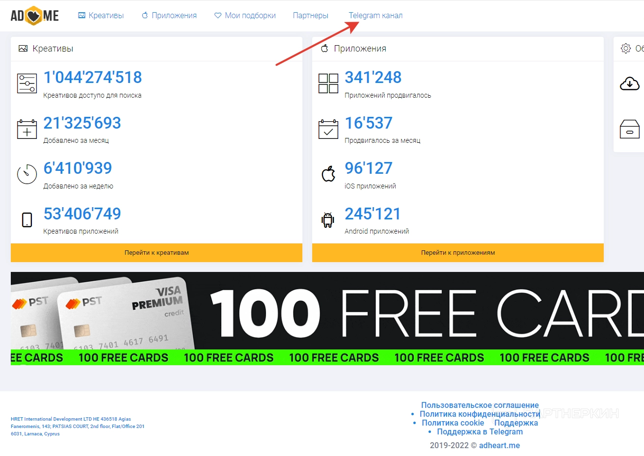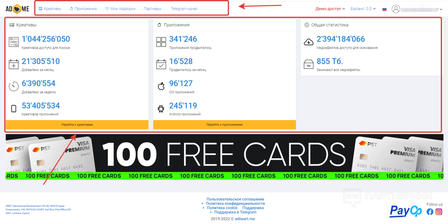 Сервис отличается интуитивно понятным интерфейсом, разделенным на два блока: панель управления и дашборд. Сразу после регистрации пользователя перебросит на стартовую страницу, где будет отображаться общее количество доступных креативов и приложений, которые продвигались за счет функционала