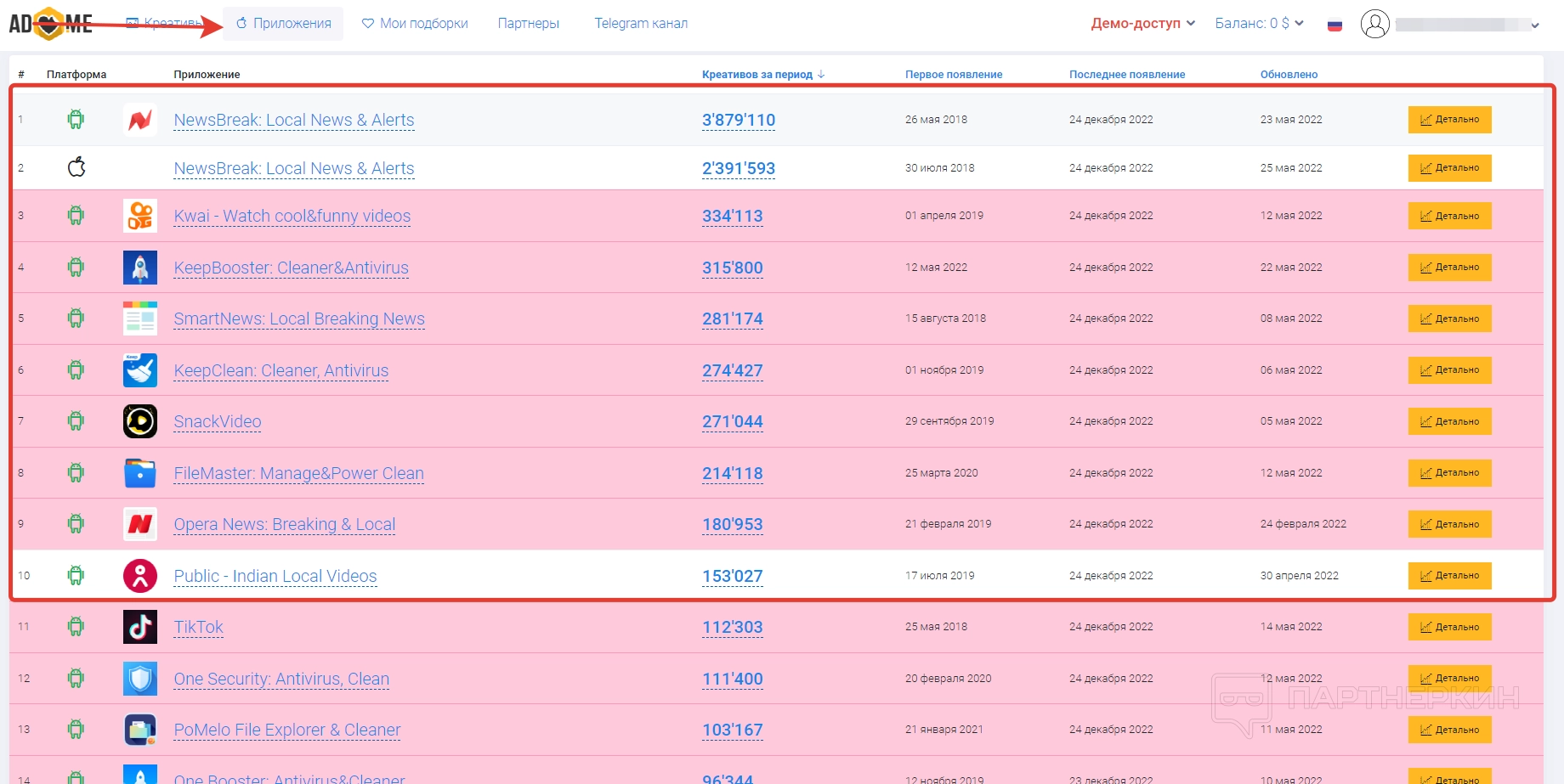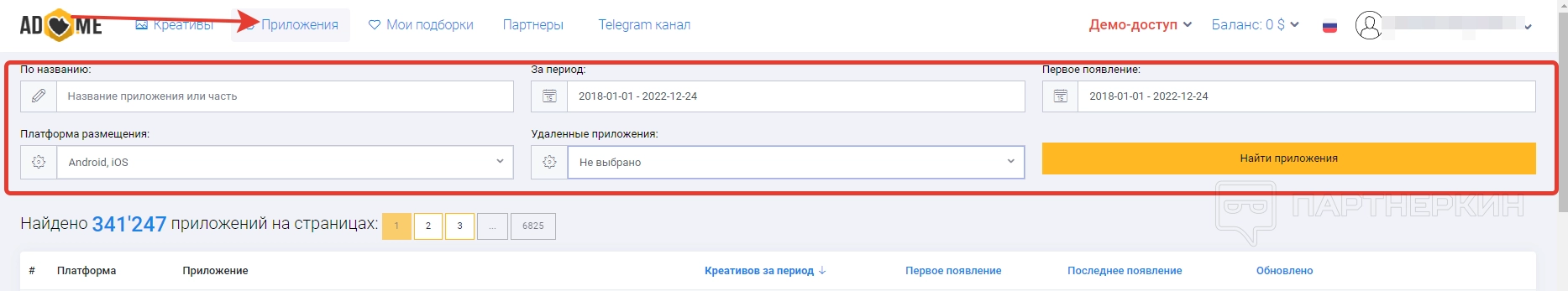 Следующий раздел — «Приложения». Здесь осуществляется поиск прилок, в которых задействовались креативы из сервиса. В дашборде раздела отображены самые популярные приложения с наибольшим количеством креативов за определенный период. Получить детальную статистику по прилкам можно только после оформления подписки.