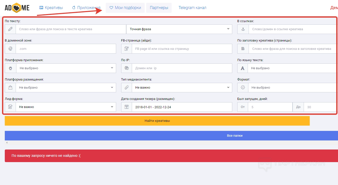 Раздел «Мои подборки» позволяет сохранять понравившиеся креативы. В нем предусмотрена такая же фильтрационная система, как и в блоке «Креативы». То есть пользователь здесь тоже может использоваться определенные параметры для поиска и сохранять подходящие креативы в отдельные подборки.