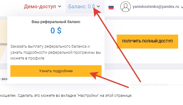 Если пользователь хочет ознакомиться с деталями партнерской программы, следует нажать на «Баланс» и кликнуть на кнопку «Узнать подробнее».