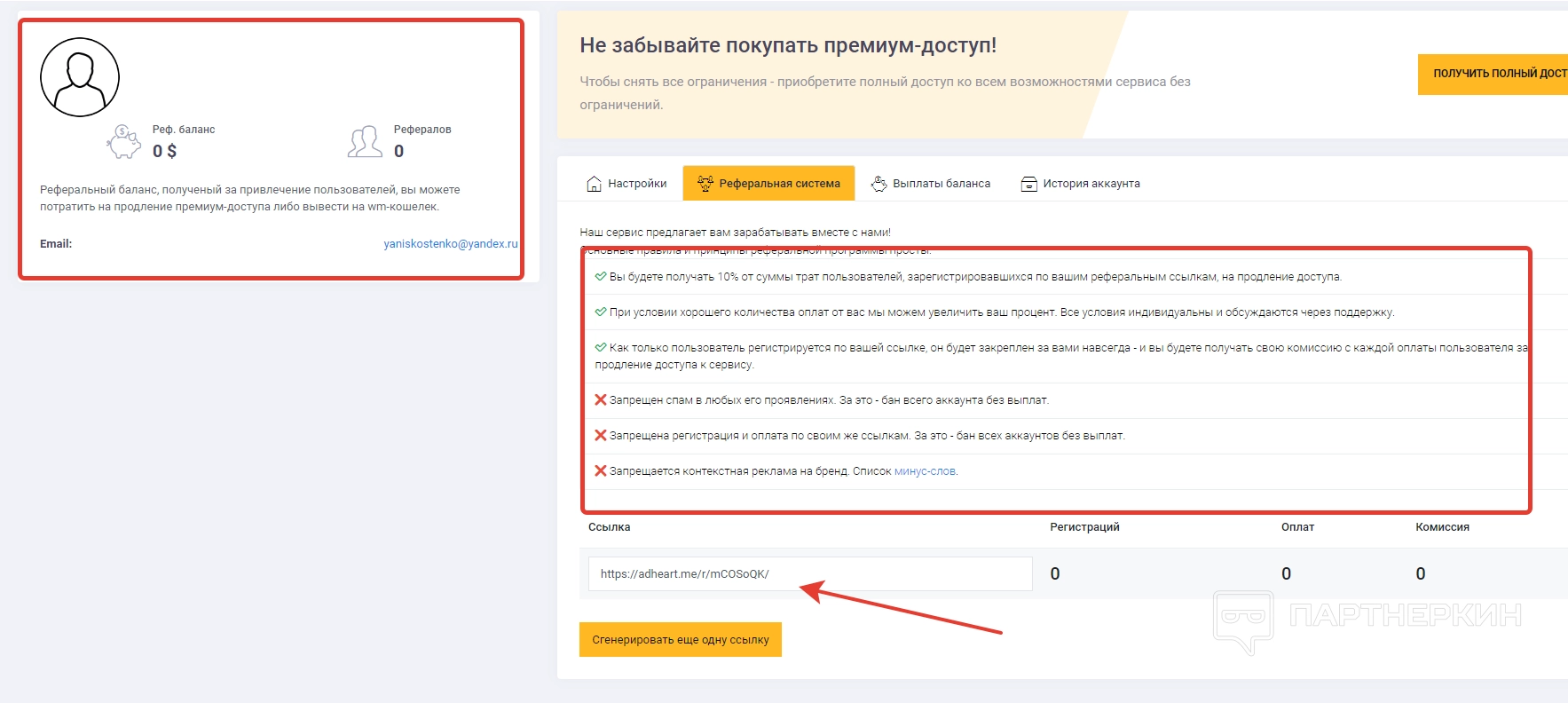 После этого откроется страничка из раздела настроек, где будут прописаны условия партнерки и баланс, заработанный от действий рефералов. В нижней части экрана можно найти партнерскую ссылку. Возле URL отображается количество регистраций, оплата и комиссия.