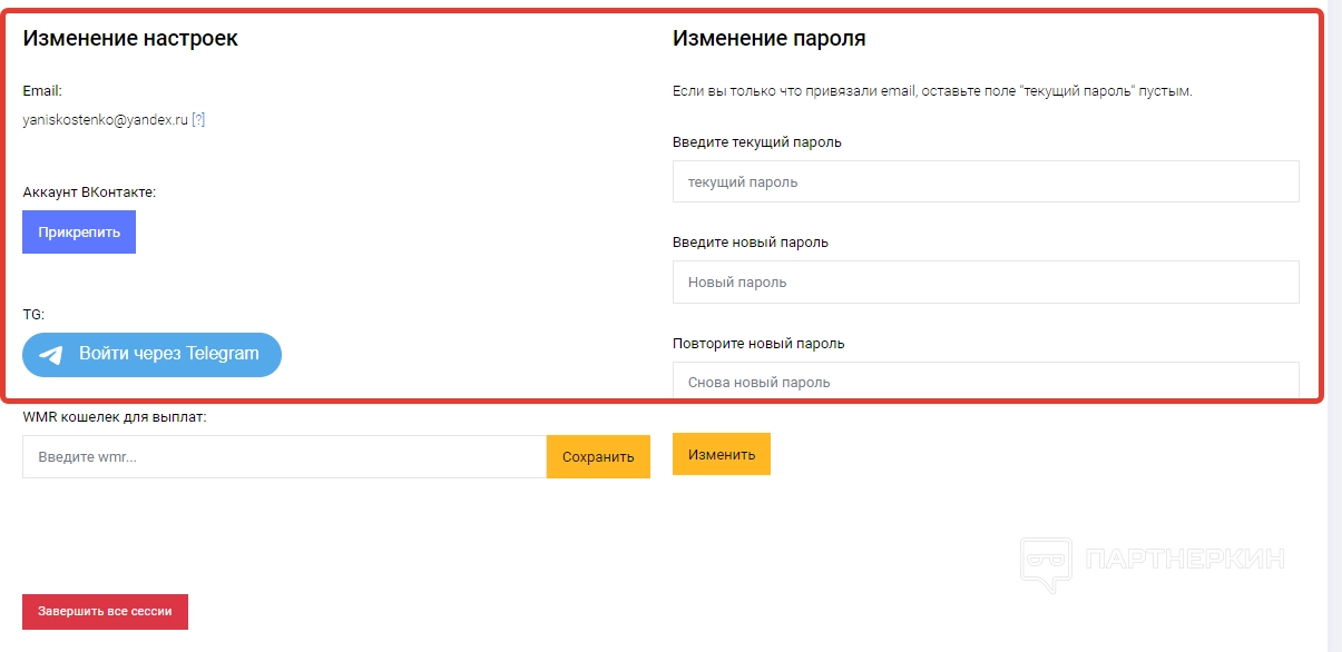 Далее откроется окно, где можно изменить пароль, подключить аккаунты и привязать кошелек WMR для выплат.