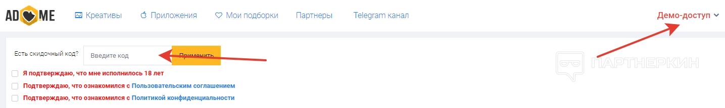 При оформлении подписки можно использовать скидочный код. Чтобы его ввести, кликаем на раздел «Демо-доступ», выбираем тариф и вставляем код в верхнем левом углу.
