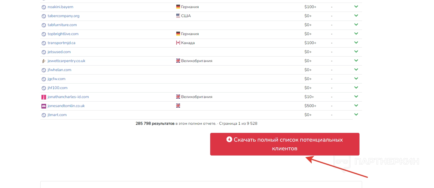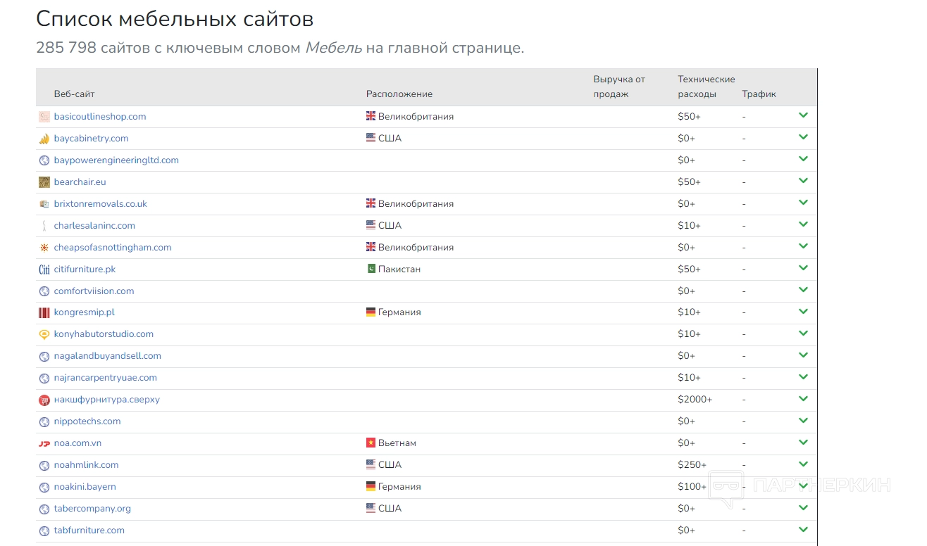 4. После этого откроется страница, где будет список самых популярных сайтов с ключевым словом «Мебель». Фильтроваться веб-сайты будут по ГЕО, доходам, техническим расходам и трафику.