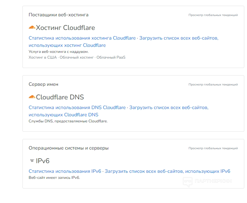 После поиска на экране появится страница с разной информаций о выбранном сайте или технологии. При отображении веб-ресурсов система чаще всего показывает такую информацию, как хостинг, сервер, операционная система и используемые технологии.