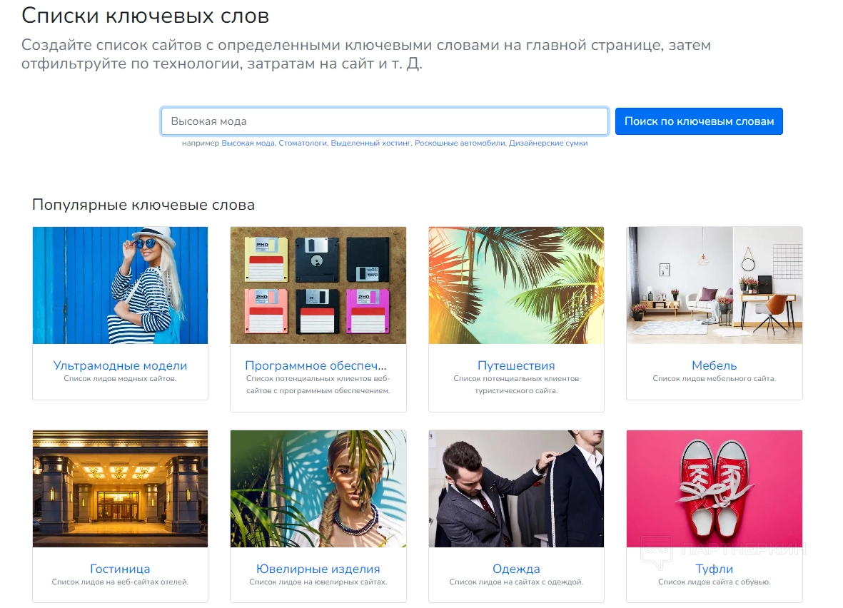 2. Далее откроется окно, где будет поисковая строка для поиска ключевиков и целая библиотека заранее собранных ключей, разделяющих сайты по категориям (ультрамодные модели, программное обеспечение, путешествия, мебель и так далее). Всего на странице более 30 категорий ключей.