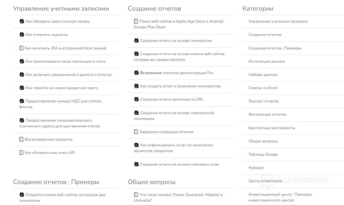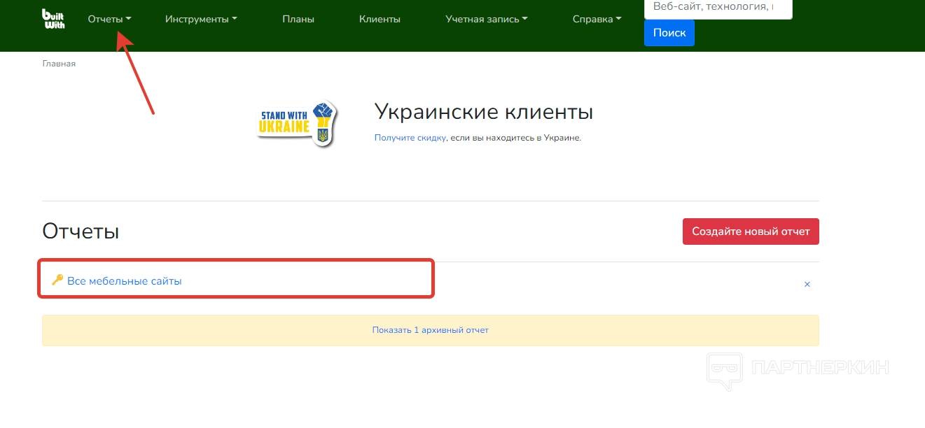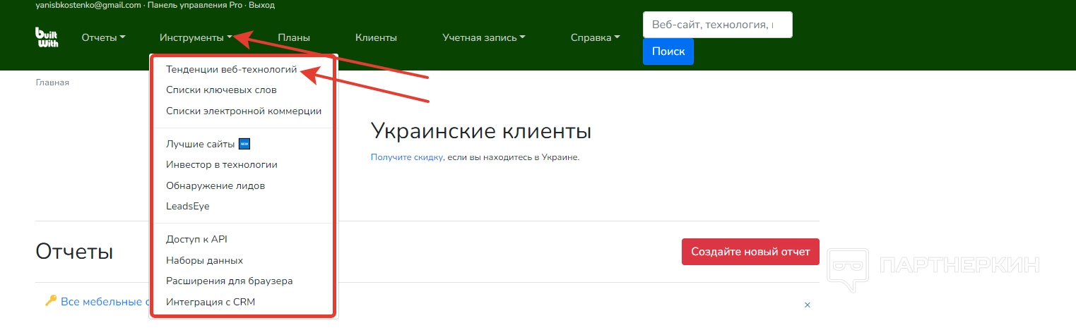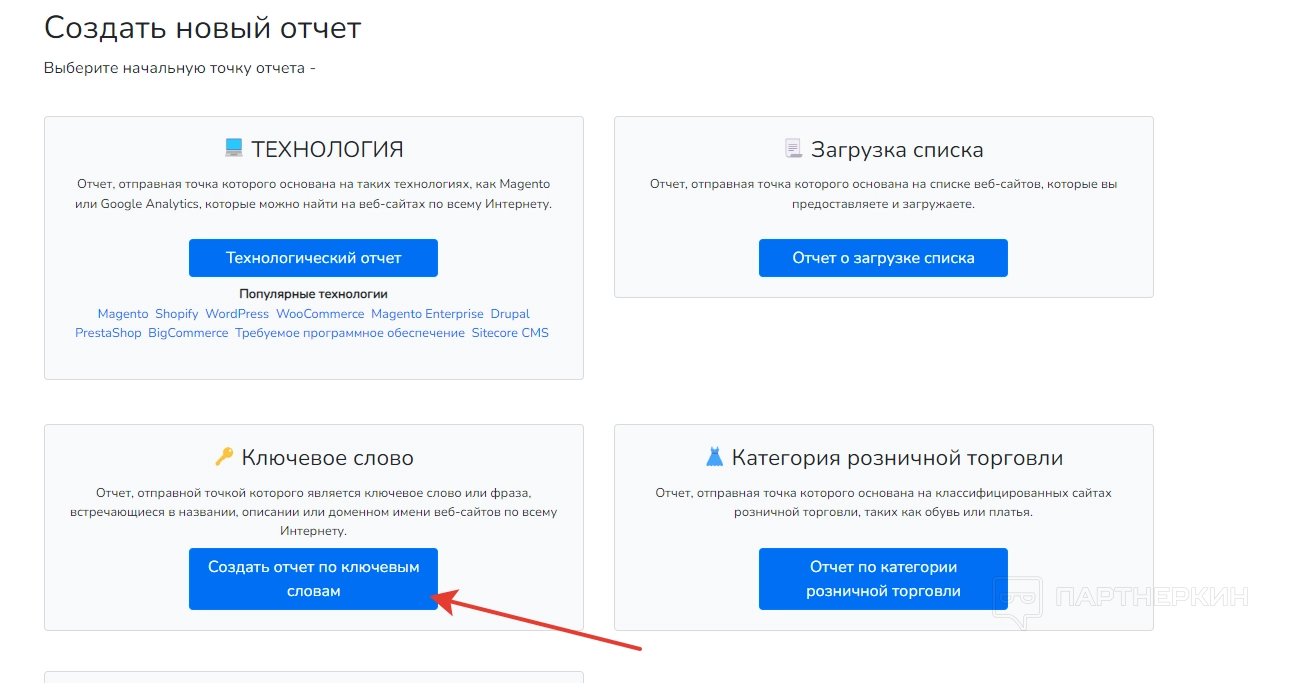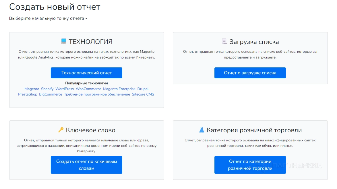 - отчеты — создаются отчеты по сайтам, технологиям, ключевым словам и так далее;