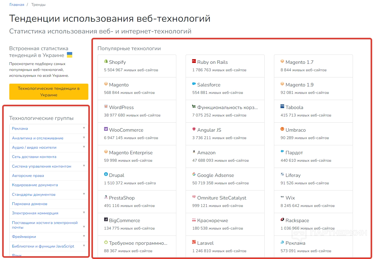 Самый сложный раздел «Инструменты» состоит из 11 блоков. Первый блок – «Тенденции веб-технологий». В нем отображается статистика по использованию тех или иных технологий в разных веб-сайтах.