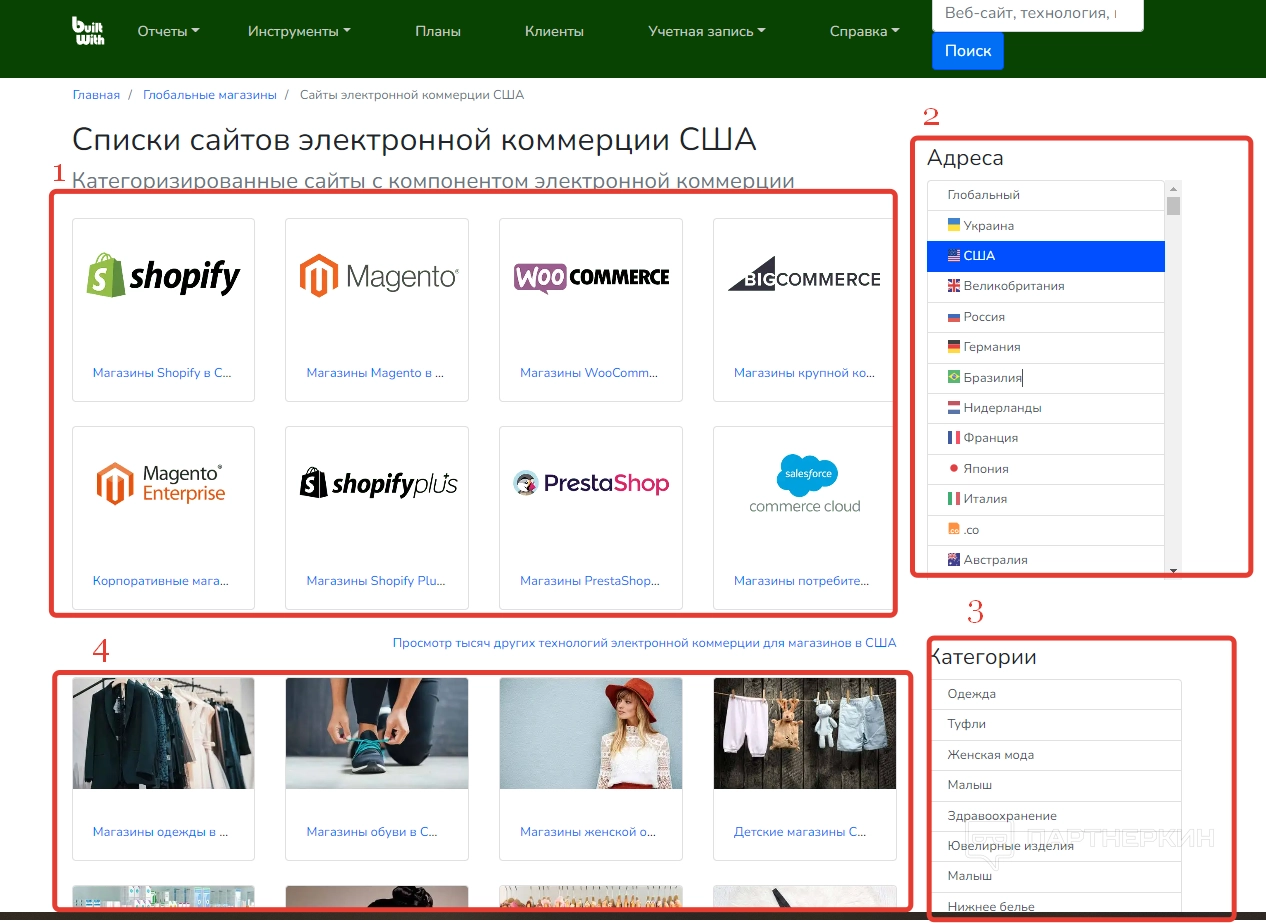 Далее идет блок «Списки электронной коммерции». В нем отображаются все коммерческие веб-ресурсы, занимающиеся продажей разного рода продукции. Чтобы пользователю было проще искать нужный сайт, система предлагает выбор по нескольким параметрам: