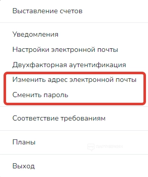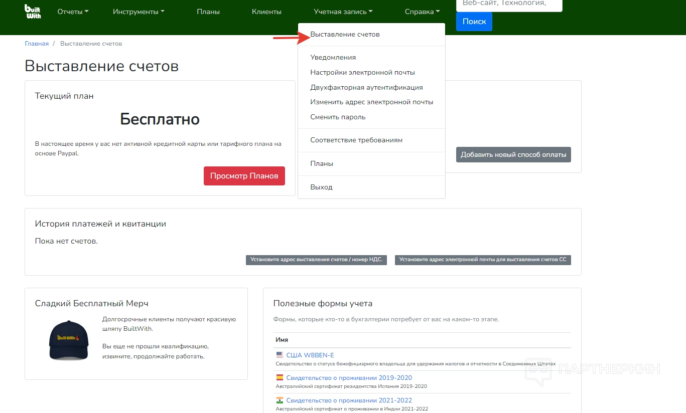 - выставление счетов — в нем указан текущий план и поддерживаемые способы оплаты;
