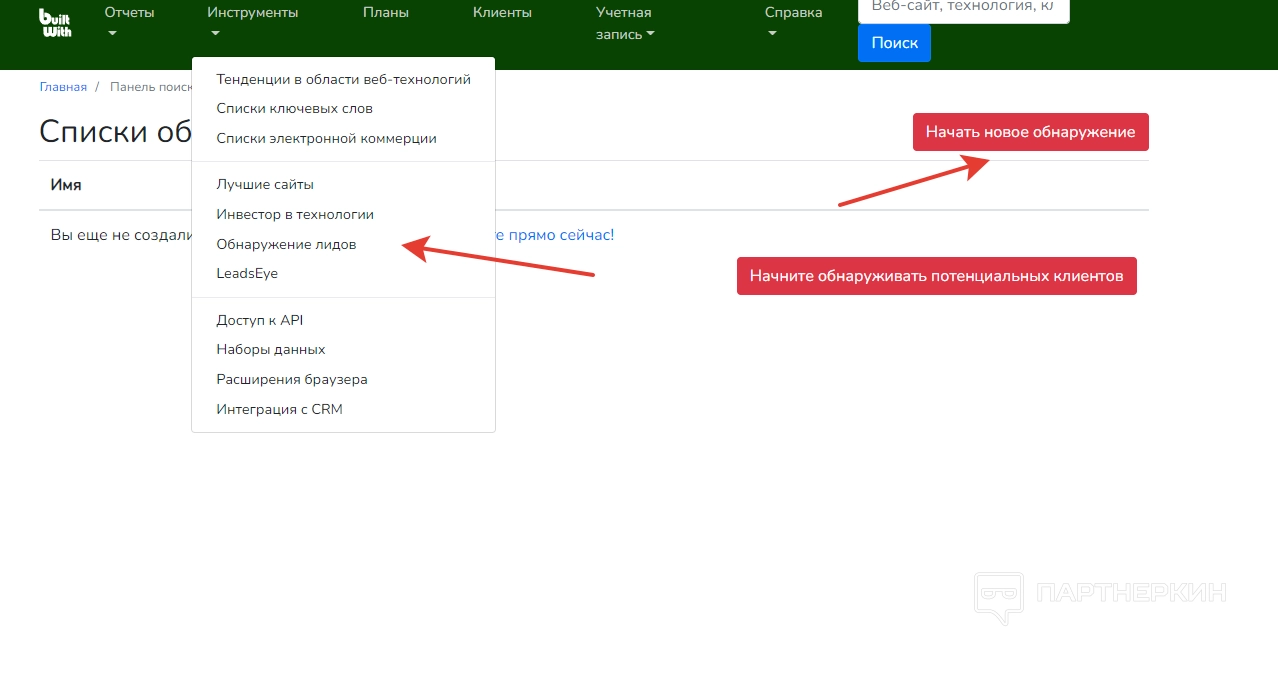 Далее идет блок «Открытие лидов», в котором можно создавать списки с клиентами из разных сайтов. Чтобы создать список, переходим в соответствующий раздел и жмем «Начать новое обнаружение».