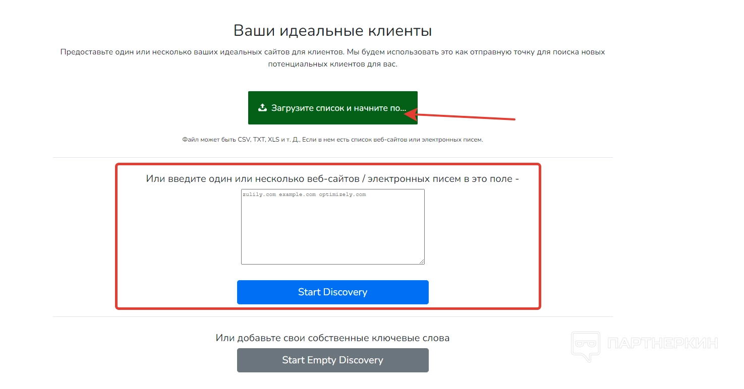 Потом откроется страница, где потребуется загрузить файл со списками в форматах CSV, TXT, XLS или добавить ссылки на сайты в специальное окно.