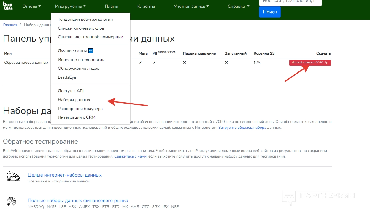 Блок «Наборы данных» содержит встроенные наборы данных, предоставляющие массовый доступ к информации об использовании интернет-технологий. Как указано на сайте, наборы эти обновляются ежедневно. Чтобы скачать образец набора, жмем на соответствующую кнопку.