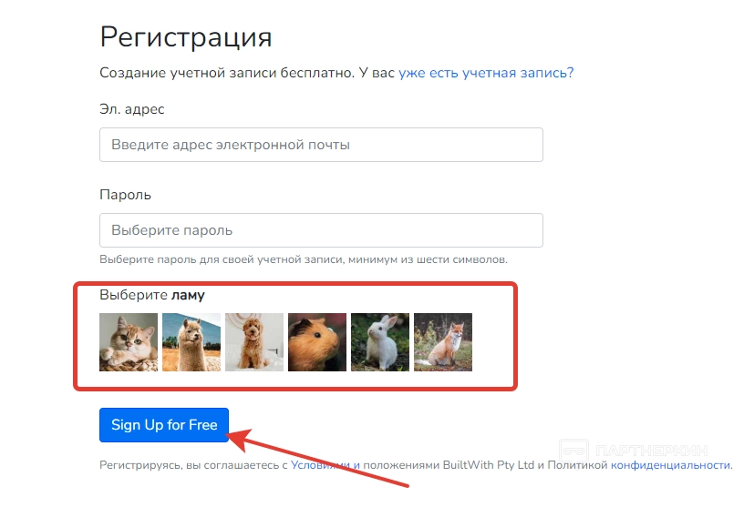 В процессе регистрации нам нужно ввести адрес электронной почты, пароль и выбрать изображение, которое запрашивает система. После — жмем на кнопку «Sign up for Free».