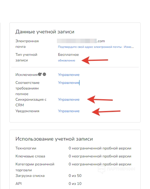 Если спуститься ниже, то в правой части интерактивного окна, можно найти блок с данными об учетной записи. В этом блоке переключаются тарифные планы, настраиваются уведомления и подключаются CRM-системы.