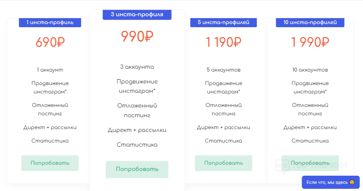 Цены на платформе зависят от количества подключаемых аккаунтов. Все тарифы предоставляют полный комплекс услуг, отличается только число страниц. Оплата взимается каждый месяц.
