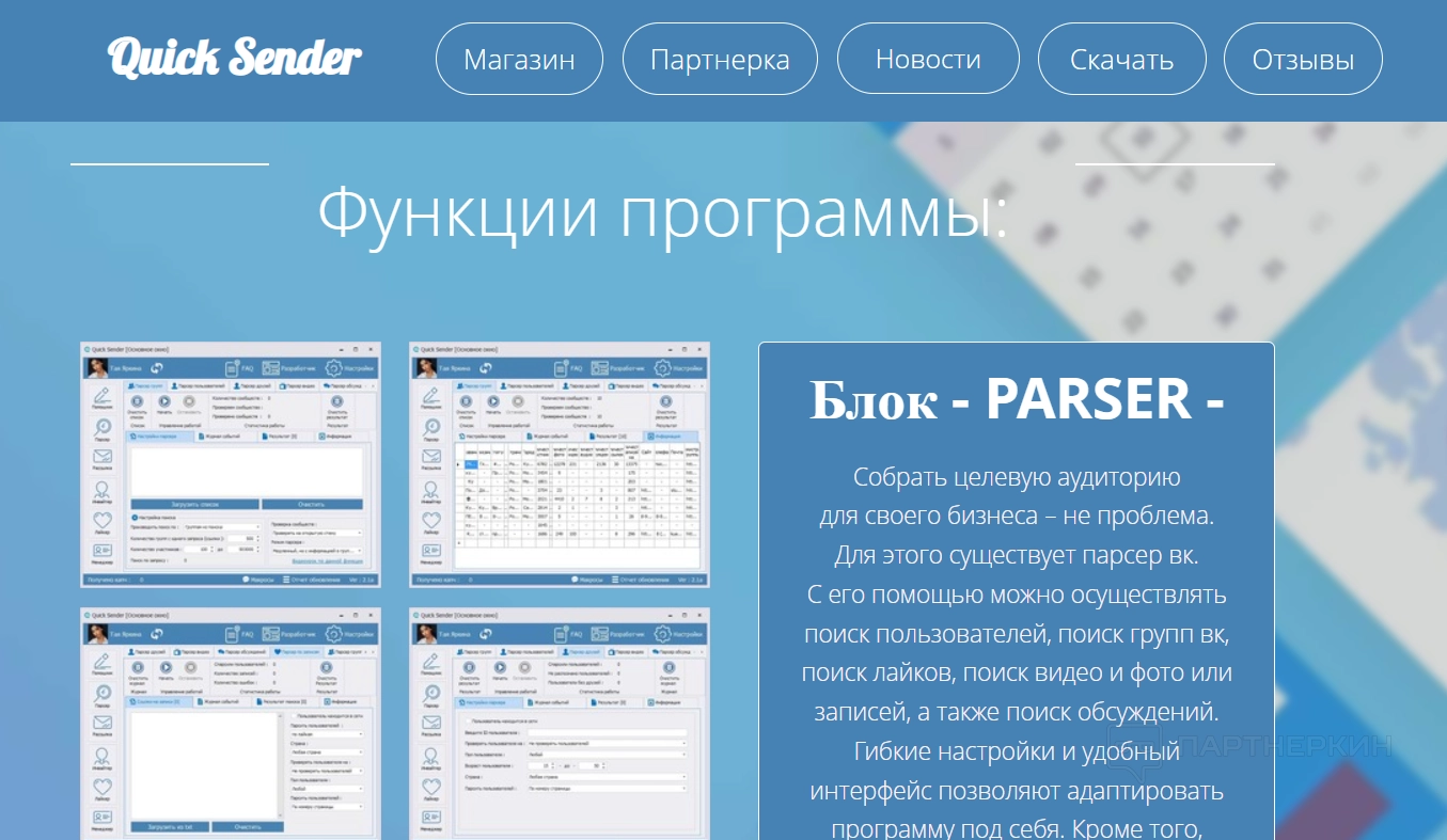 - парсер для сбора аудитории : инструмент, который позволяет собирать данные о пользователях, которые могут заинтересоваться продуктом или услугой. Это позволяет сократить время на поиск нужного сегмента аудитории и сделать работу более эффективной;