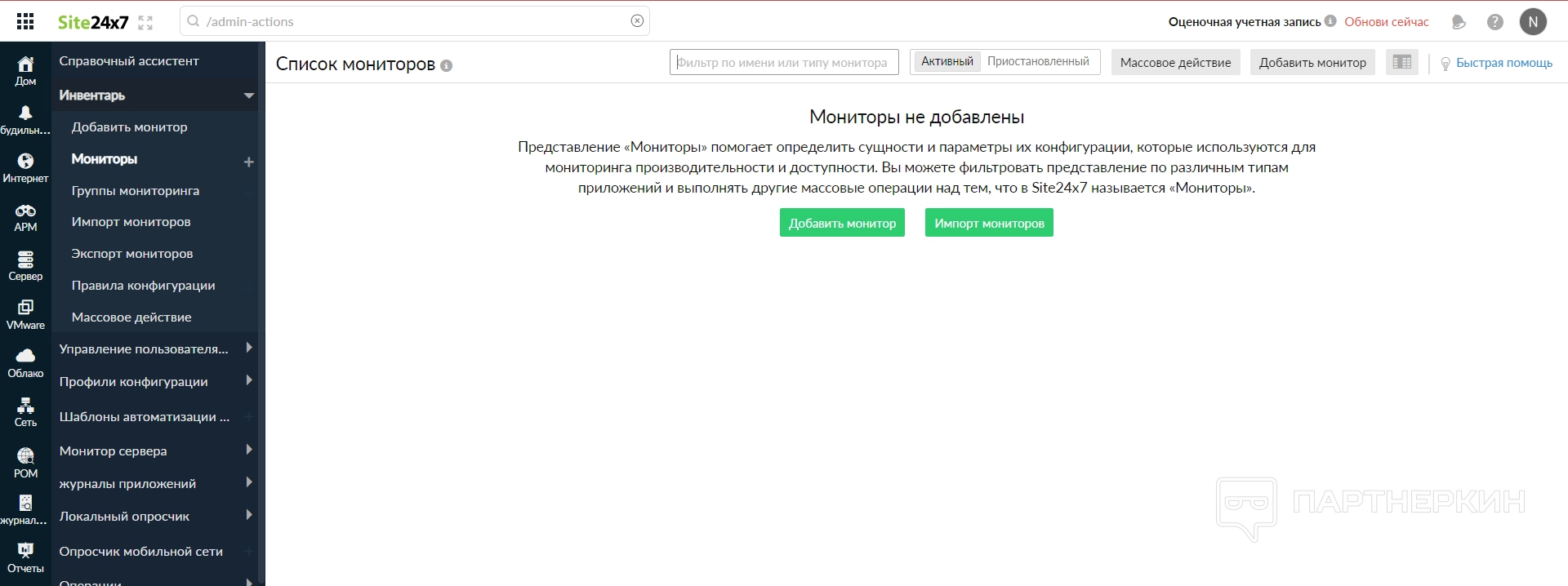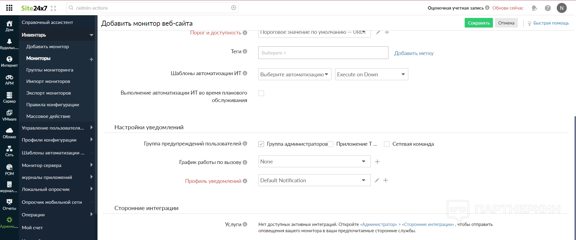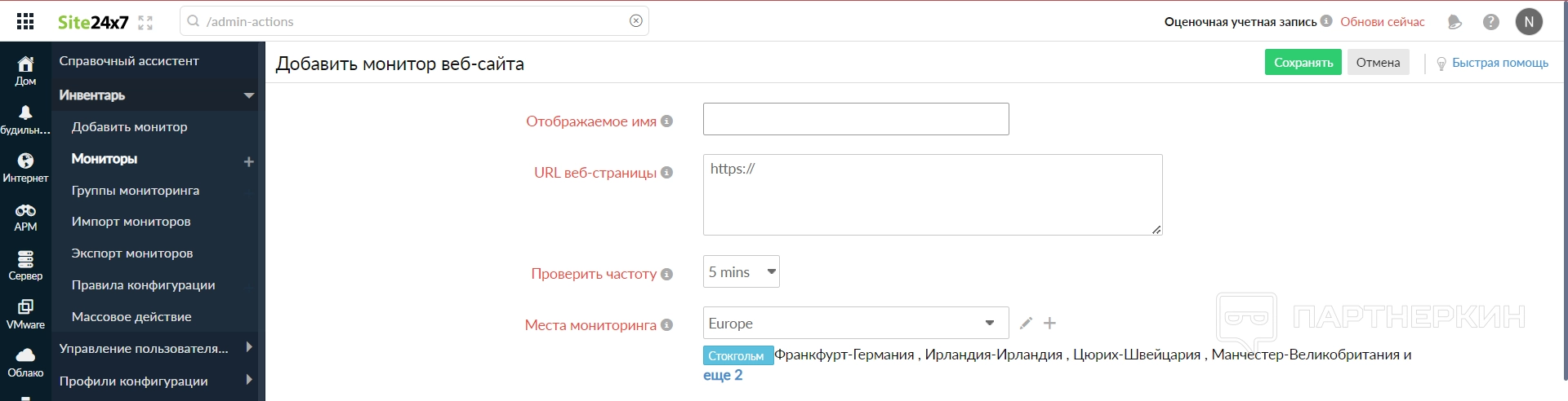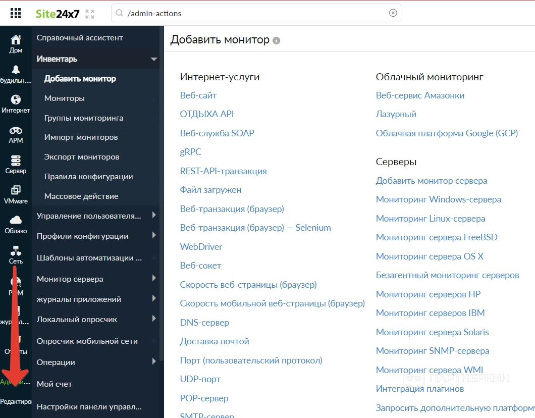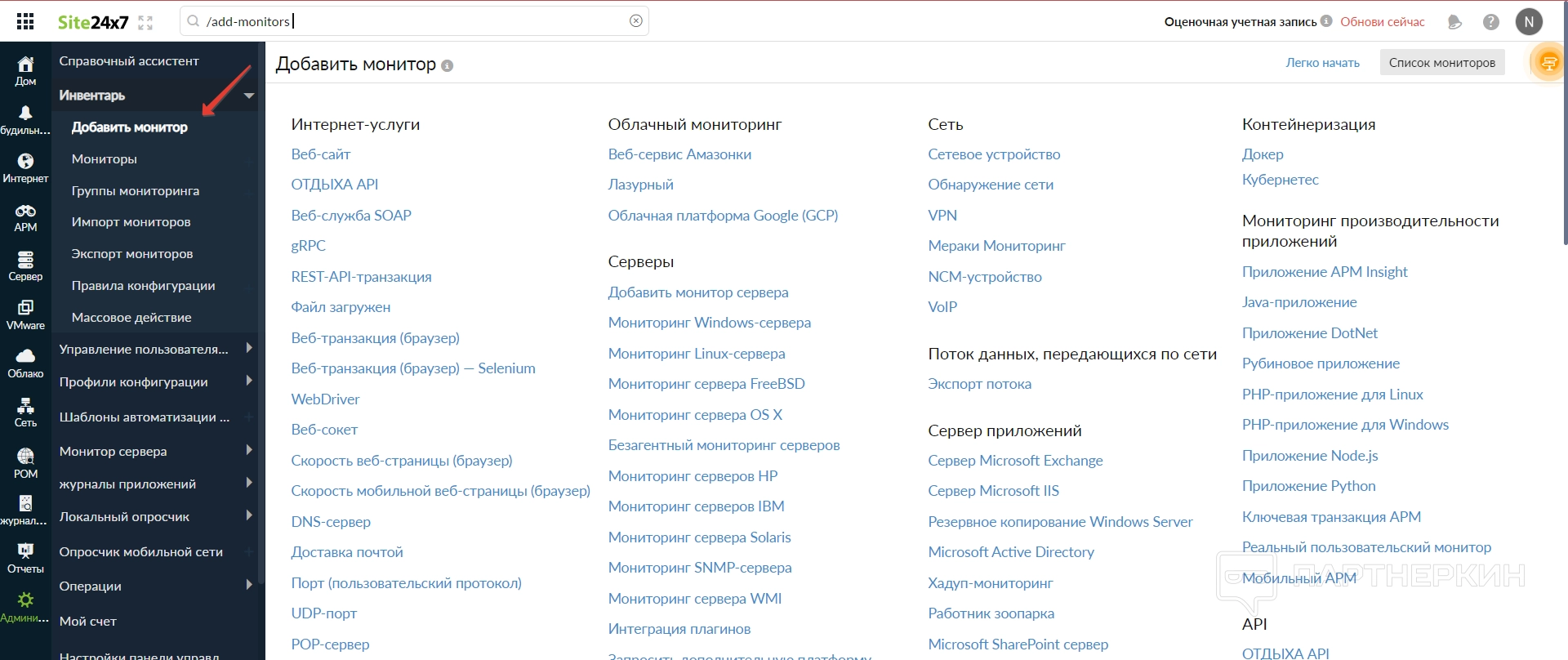 - добавить мониторинг — здесь пользователь может выбрать тип мониторинга, при этом список гораздо больше, чем на основной странице;