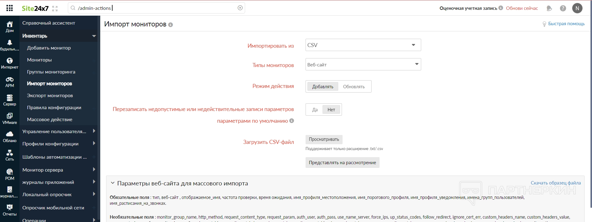 - импорт мониторинга — чтобы не добавлять вручную данные, их можно перенести в формате CSV-файла;