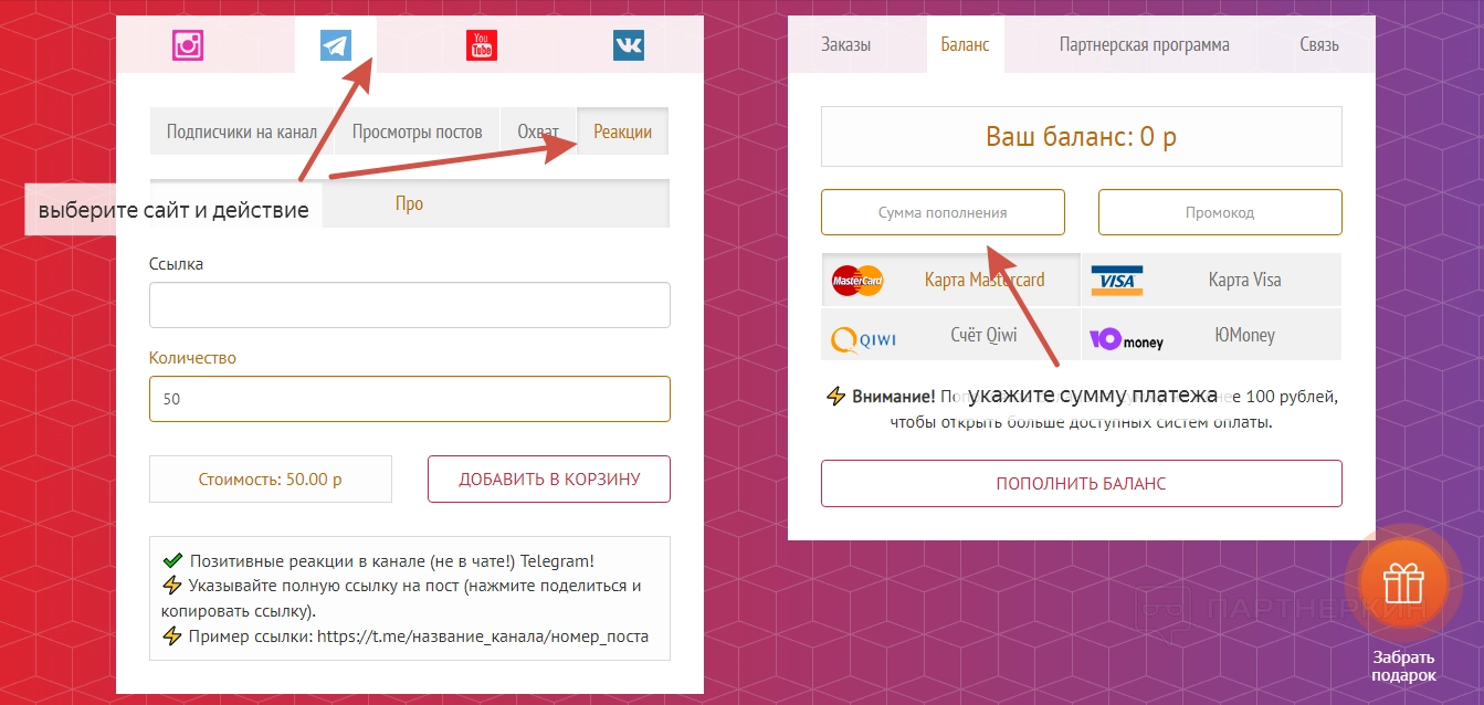 После авторизации в столбце справа появится информация пользователя. Пополните баланс на нужную сумму во вкладке «Баланс», используя подходящий платежный метод.
