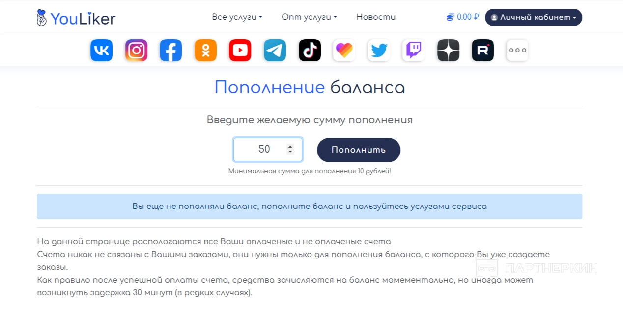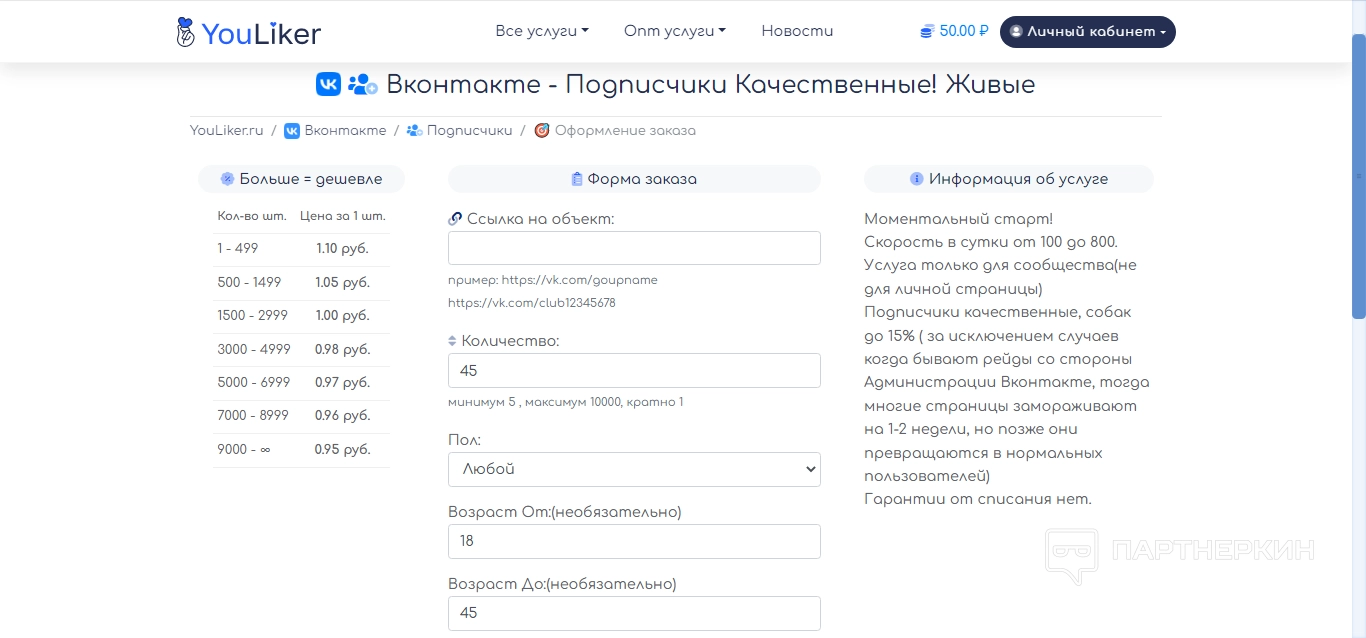 Зарегистрированные пользователи могут приглашать в систему новых клиентов по собственной уникальной ссылке. Платформа выплачивает отчисление от каждой финансовой операции реферала: 10% за пополнение баланса и 10% за траты на услуги, предоставленные на сайте. Реферальную ссылку можно создать не только для главной страницы, но также для внутренних страниц с услугами, например, направить посетителя напрямую на заказ подписчиков ВК.