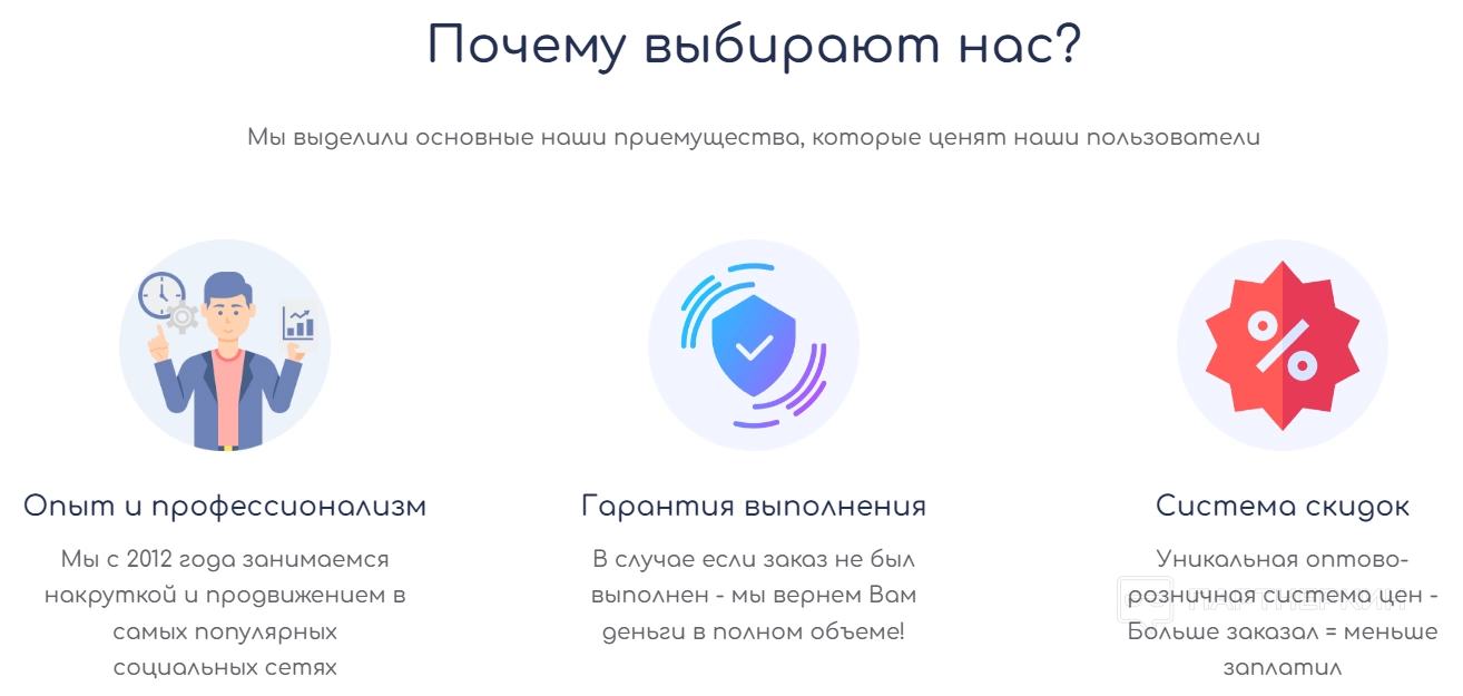 На странице предложений просмотрите и выберите подходящий вам по условиям оффер. Всю нужную информацию можно прочитать на карточке товара: в центре находятся краткие условия и цена за 1 штуку, под кнопкой заказа – дополнительная информация о качестве услуги (наличие ботов и неактивных пользователей, время старта и выполнения, наличие гарантии и т.д.)