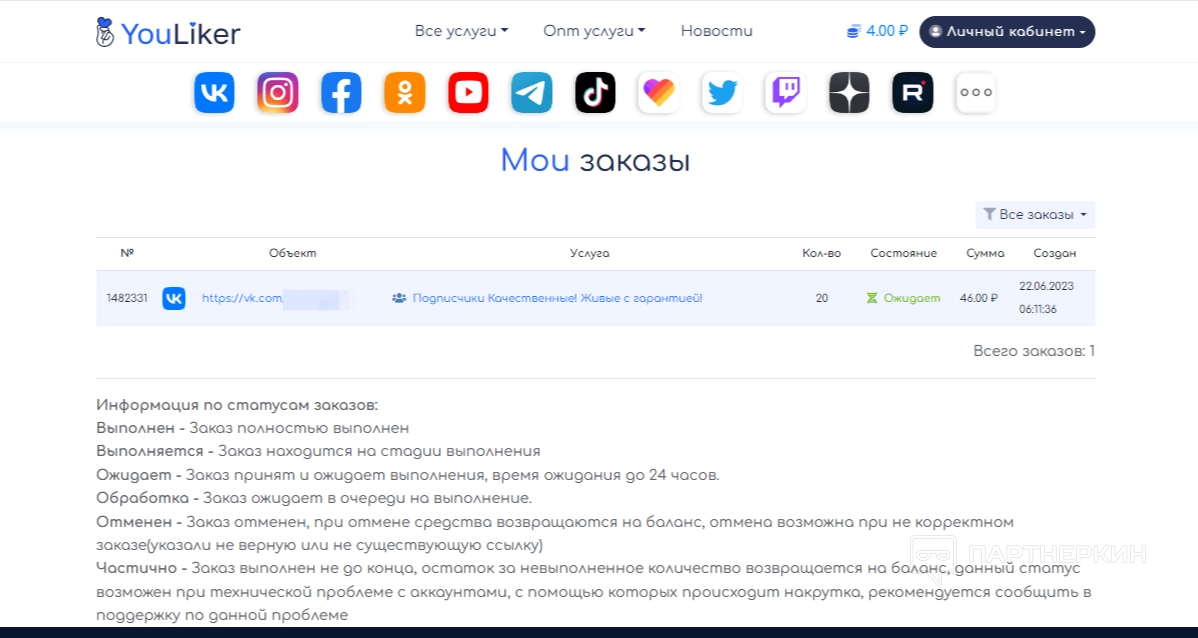 Покупку могут отклонить – это возможно, если указаны неверные условия (неработающая ссылка, закрытая страница и т.д.), тогда денежные средства вернутся на баланс. Также заказ может быть выполнен частично. Такое бывает при технических работах на сайте или блокировке исполнителей. В этом случае на баланс вернется часть средств.