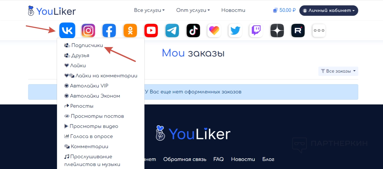 Услуги на сервисе рассортированы по социальным сетям и категориям. Сначала нужно выбрать требуемую площадку – их список отображается на всех страницах сайта под главным меню. Наведя на иконку курсор, можно увидеть категории услуг. Выберите подходящий пункт и щелкните на него, чтобы открыть страницу с предложениями.