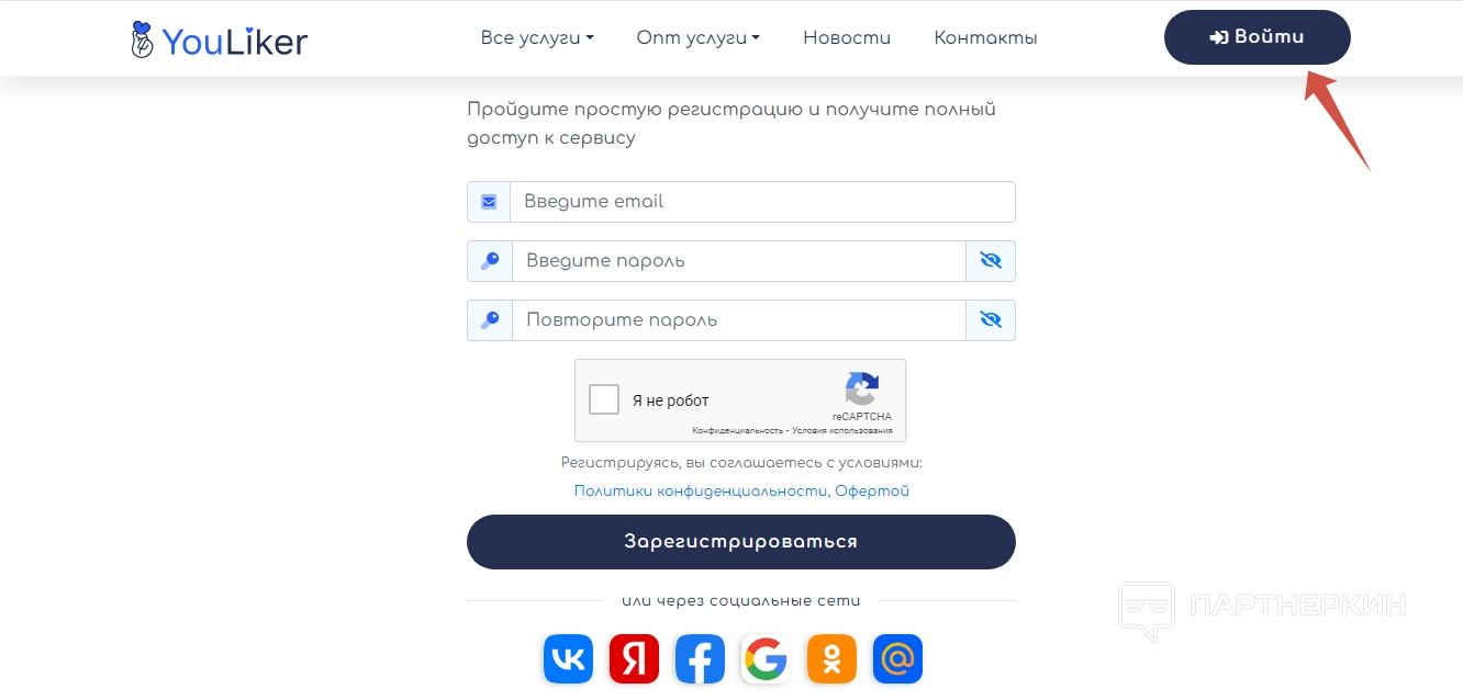 Возможность оформлять заказы на сайте доступна только зарегистрированным пользователям, поэтому предварительно требуется создать аккаунт. Для этого нажмите «Войти» и отыщите вкладку регистрации. Кроме стандартного входа по электронной почте, поддерживается авторизация через ВК, Яндекс, Facebook*, Google, Одноклассники.