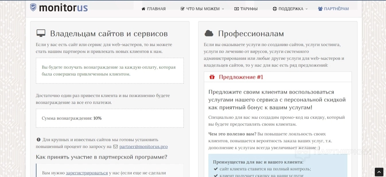 Для желающих заработать есть несколько вариантов партнерской программы. Разработчики сервиса приглашают к сотрудничеству владельцев сайтов и сервисов, веб-разработчиков, а также тех, кто сам оказывает услуги хостинга, VPS и Dedicated.