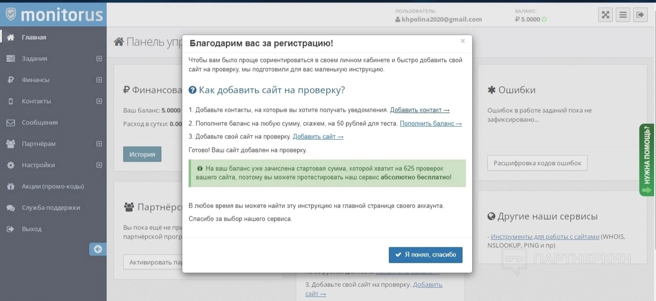 Есть несколько вариантов оплаты, а также демо-версия для ознакомления с возможностями платформы в виде одной проверки своего сайта. Новичкам при регистрации предоставляется небольшой бонус в виде 5 рублей на баланс кабинета.