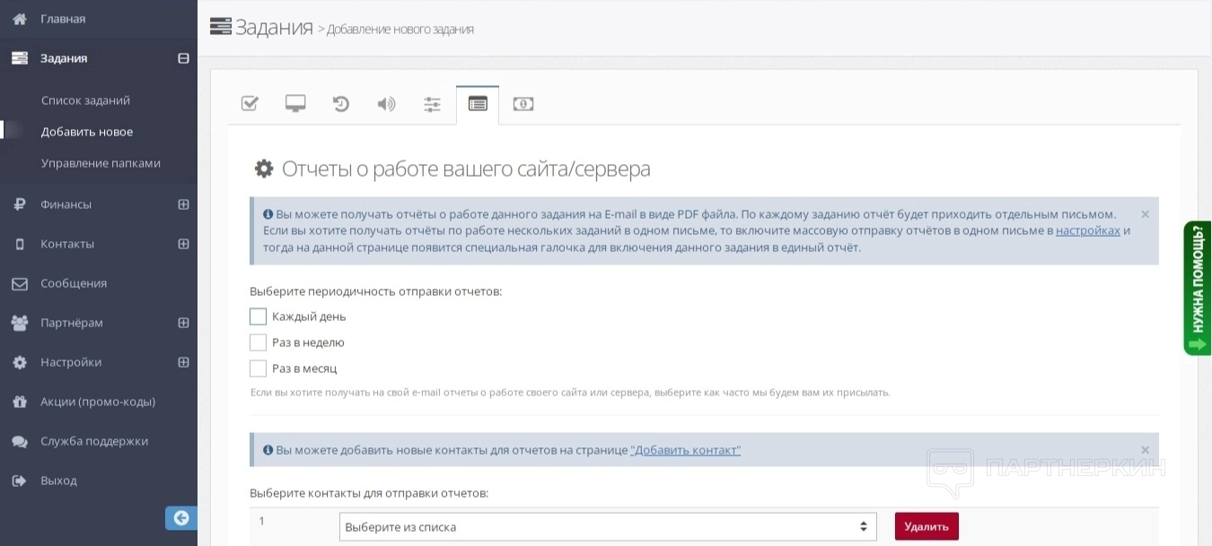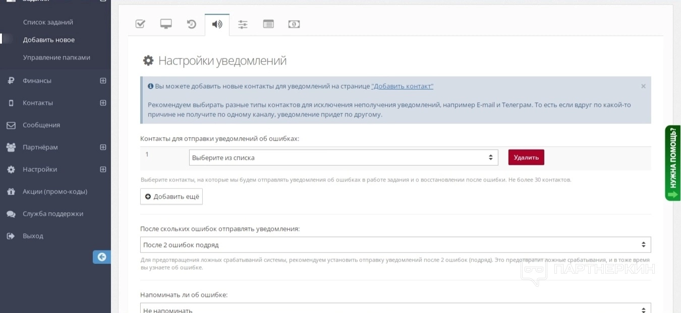 После прохождения авторизации сервис автоматически напоминает каждому пользователю про обновление контактов для оповещений, пополнение баланса и создании новой задачи.