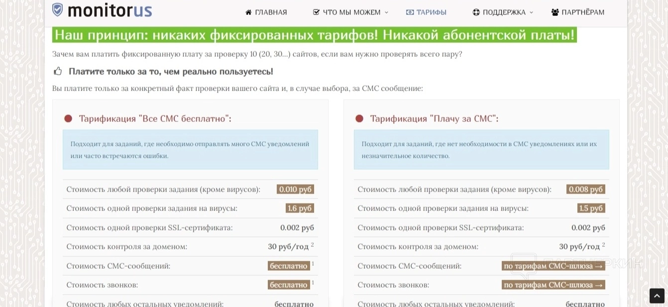 У сервиса гибкая система тарифов, которая подразумевает оплату только за те услуги, которыми действительно пользуется клиент. Помимо этого можно дополнительно подключить СМС-оповещения, если это требуется.