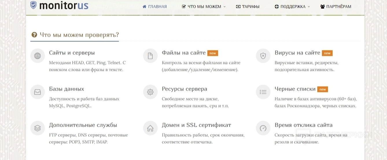 Основное направление, конечно же, это проверка работоспособности сайта с разными интервалами во времени. Однако помимо этого платформа может предложить такие виды услуг, как: