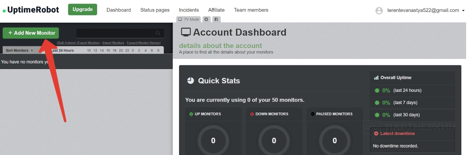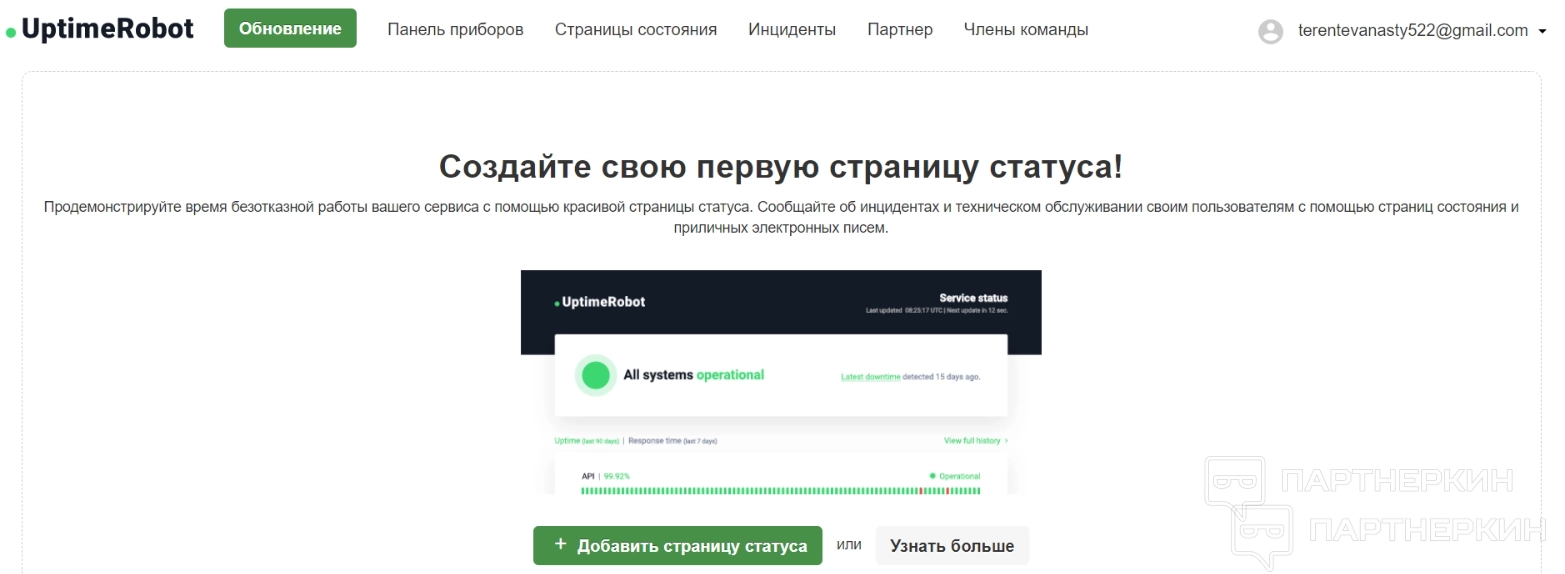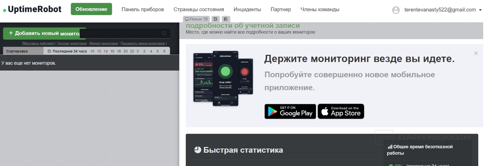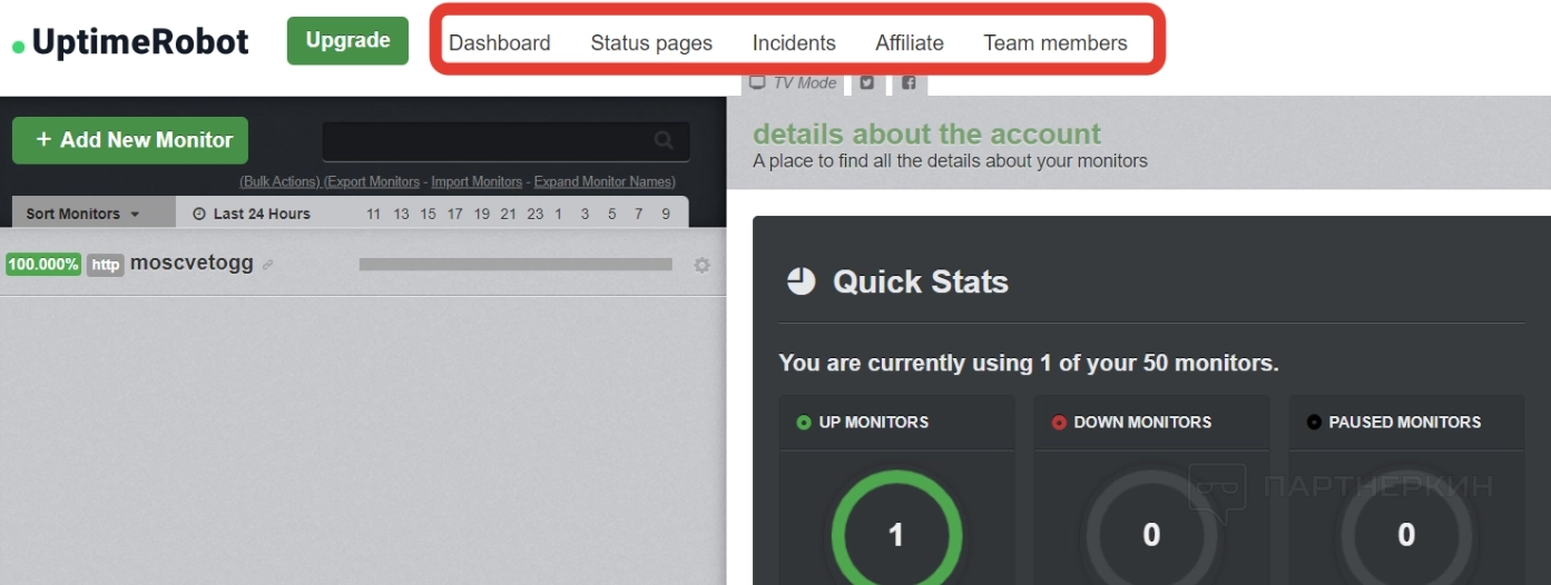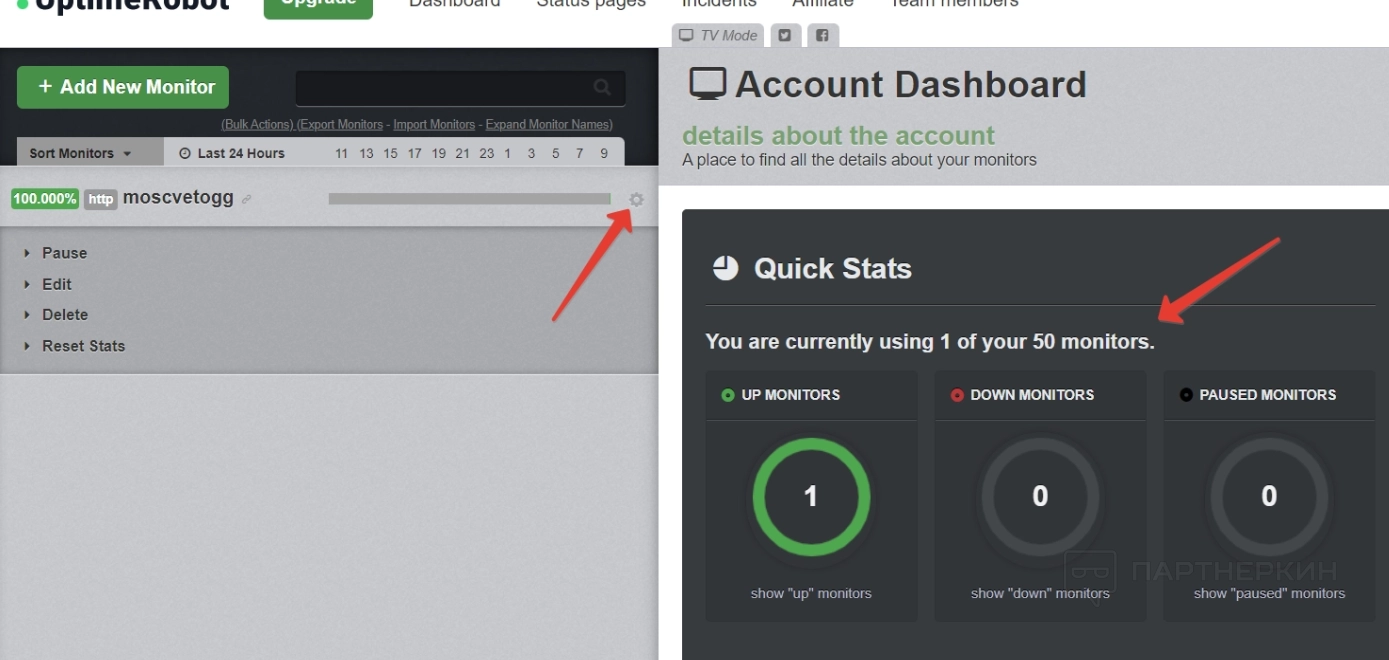 Когда хотя бы один монитор появится в списке, в дашборде справа появятся изменения — будет написано, сколько мониторов уже добавлено, и сколько можно добавить. Также покажут статистику доступности за последние 24 часа, семь дней и месяц. Все это видно на скрине выше.