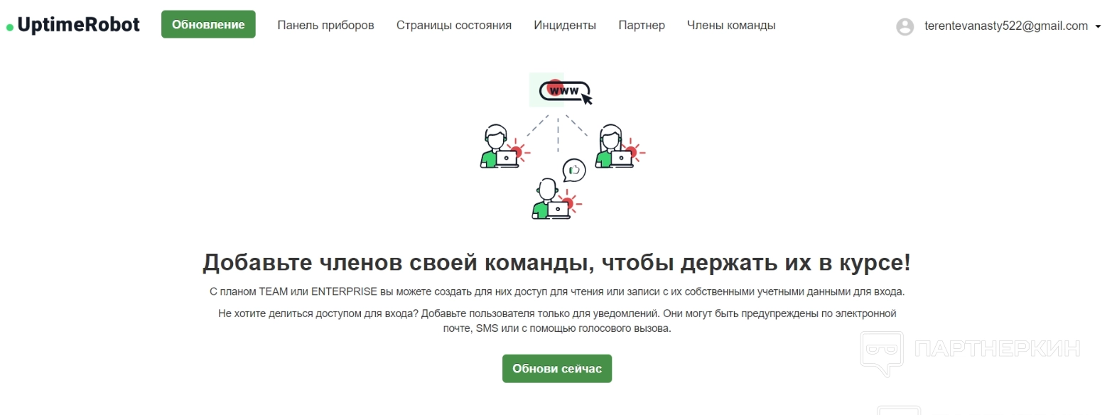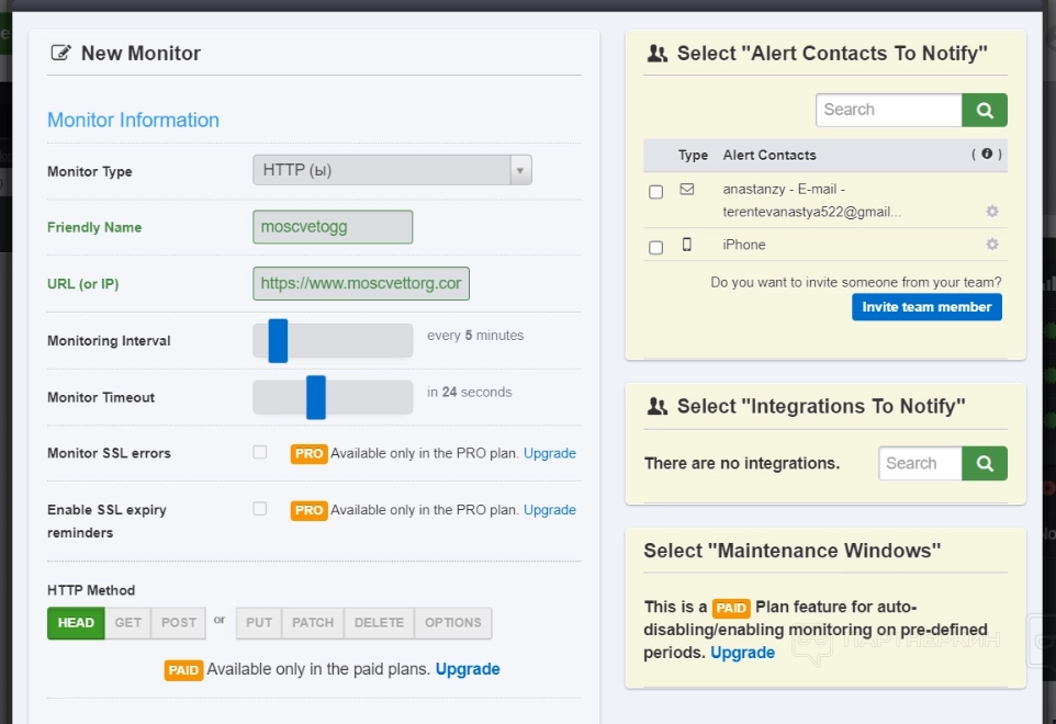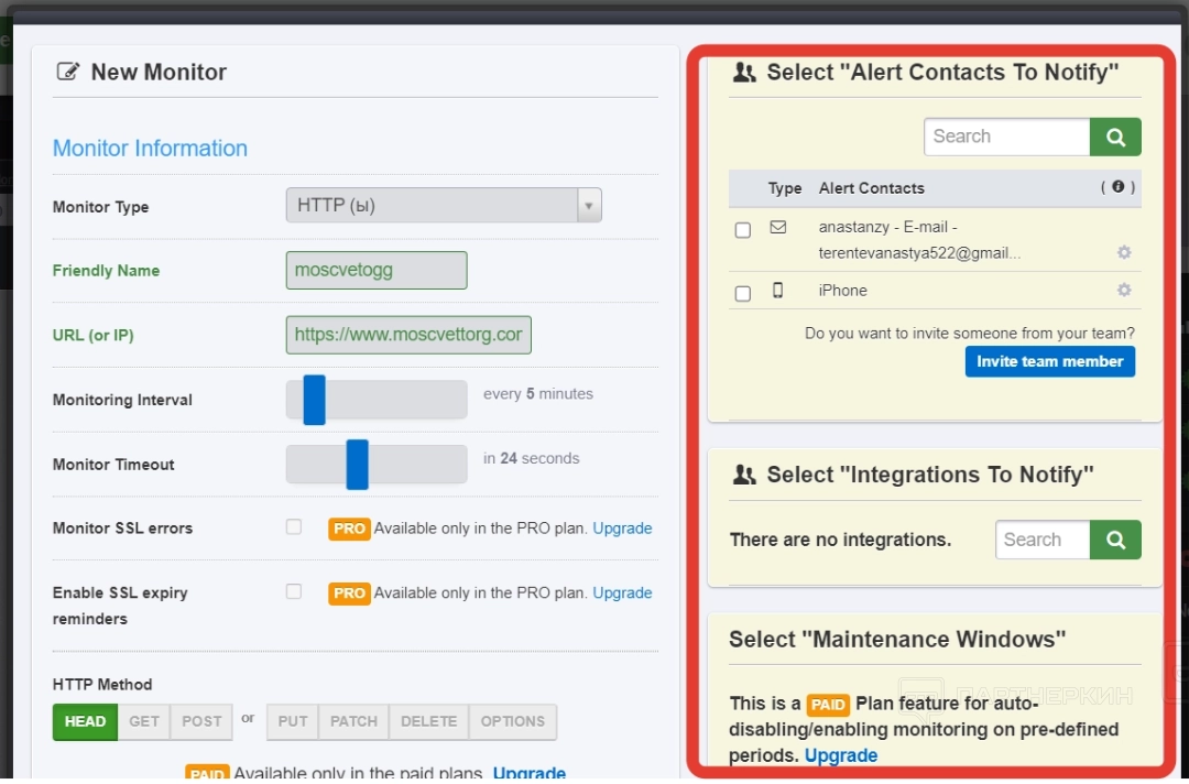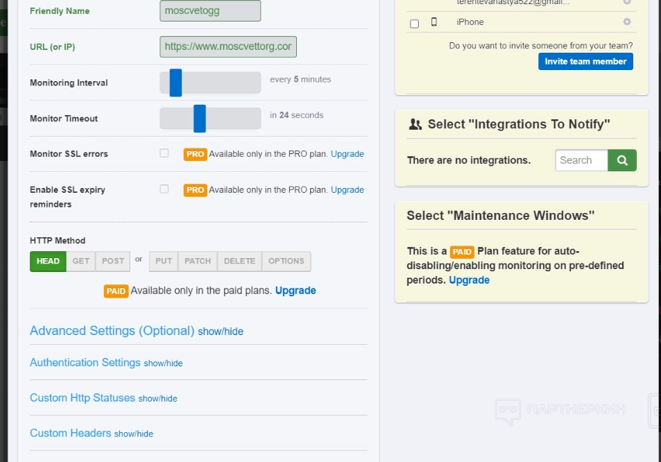 На скрине видно, что с правой стороны есть сводная табличка с данными — там указано, кому принадлежит учетная запись, и на каких устройствах она открыта. Здесь же можно подключить интеграции, чтобы получать уведомления, в случае если система обнаружит недоступность сайта. Помимо этого, есть возможность добавить участников в свою команду, а также автоматически планировать отключение и включение мониторинга, но последняя фича также доступна по подписке.