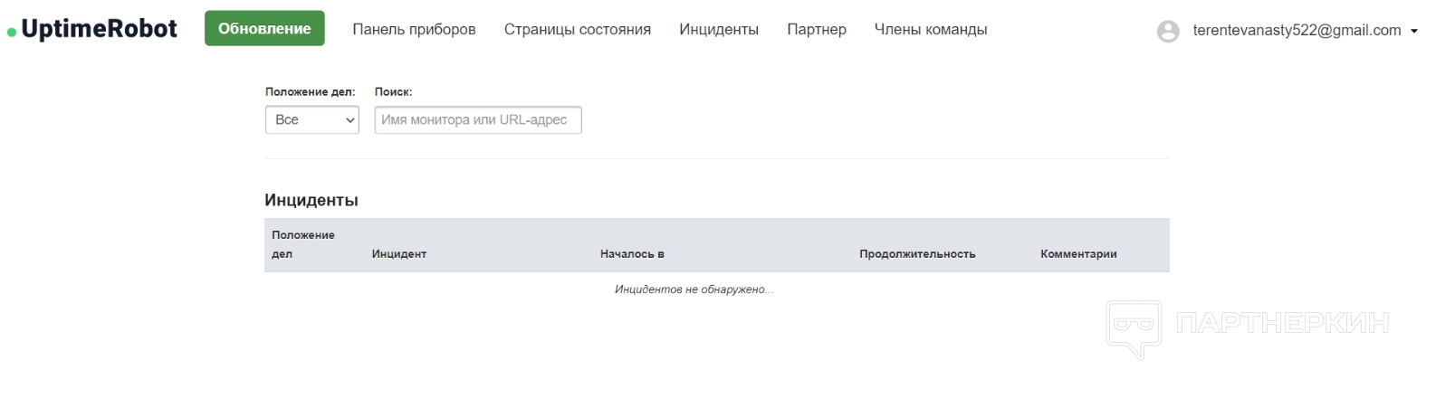 Инциденты — здесь подбивается список всех инцидентов, когда страница или сайт в целом не были доступны. Можно посмотреть его описание, время начала, продолжительность и комментарии от системы.