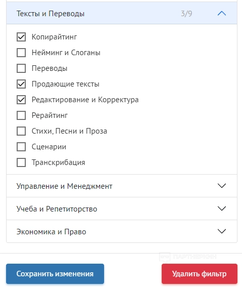 - Настроить фильтр и выбрать интересующую категорию — например, раздел «Тексты и переводы», категории «Копирайтинг», «Продающие тексты», «Редактирование и корректура». Нажать «Сохранить изменения».