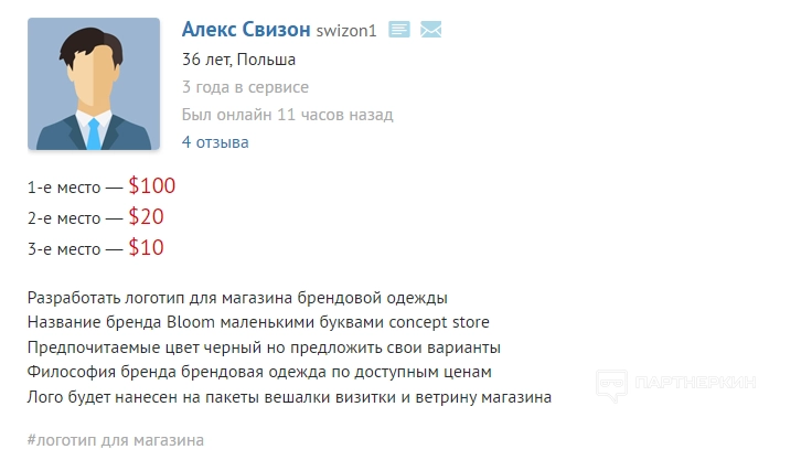 Чтобы принять участие в конкурсе, исполнителю нужно разместить одну или несколько работ на странице «Конкурсы». Если заказчику понравится работа фрилансеров, он может указать победителей. В копирайтинге такие форматы встречаются редко, зато часто появляются при создании логотипов. Пример конкурса выглядит так: